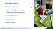 High EU standards Frontex representative Code of Conduct for Return Operations and Return Interventions Complaint Mechanism Trained escorts Monitor on board. write foot text here 2019-05-09 18 18