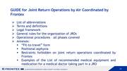 GUIDE for Joint Return Operations by Air Coordinated by Frontex List of abbreviations Terms and definitions Legal framework General rules for the organization of JROs Operational procedures – all phases covered Annexes: “Fit-to-travel” form Positional asphyxia Restraints forbidden on joint return operations coordinated by Frontex Examples of the List of recommended medical equipment and medication for a medical doctor taking part in a JRO write foot text here 2019-05-09 21 21