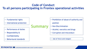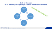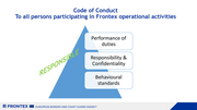 Code of Conduct To all persons participating in Frontex operational activities Performance of duties Responsibility & Confidentiality Behavioural standards write foot text here 24 2019-05-09