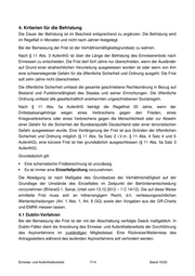 4. Kriterien für die Befristung Die Dauer der Befristung ist im Bescheid entsprechend zu ergänzen. Die Befristung wird im Regelfall in Monaten und nicht nach Jahren festgelegt. Bei der Bemessung der Frist ist der Verhältnismäßigkeitsgrundsatz zu wahren. Nach § 11 Abs. 3 AufenthG ist über die Länge der Befristung des Einreiseverbots nach Ermessen zu entscheiden. Die Frist darf fünf Jahre nur überschreiten, wenn der Ausländer auf Grund einer strafrechtlichen Verurteilung ausgewiesen worden ist oder wenn von ihm eine schwerwiegende Gefahr für die öffentliche Sicherheit und Ordnung ausgeht. Die Frist soll zehn Jahre nicht überschreiten. Die öffentliche Sicherheit umfasst die gesamte geschriebene Rechtsordnung in Bezug auf Bestand und Funktionsfähigkeit des Staates und seiner Einrichtungen. Die öffentliche Ordnung umfasst alle gesellschaftlich anerkannten ungeschriebenen Sozialregeln. Nach § 11 Abs. 5a AufenthG beträgt die Regelfrist 20 Jahre, wenn der Drittstaatsangehörige wegen eines Verbrechens gegen den Frieden, eines Kriegsverbrechens oder eines Verbrechens gegen die Menschlichkeit oder zur Abwehr einer Gefahr für die Sicherheit der Bundesrepublik Deutschland oder einer terroristischen Gefahr ausgewiesen wurde. Eine Verlängerung der Frist ist aus Gründen der öffentlichen Sicherheit und Ordnung möglich (§ 11 Abs. 5a Satz 2 i.V.m. § 11 Abs. 4 Satz 4 und 5 AufenthG), eine kürzere Frist ist hier grundsätzlich ausgeschlossen (§ 11 Abs. 5a Satz 3 AufenthG). Grundsätzlich gilt: Eine schematische Fristberechnung ist unzulässig. Es ist immer eine Einzelfallprüfung vorzunehmen. Die Abwägung ist nach Maßgabe des Grundsatzes der Verhältnismäßigkeit auf der Grundlage der Umstände des Einzelfalles im Zeitpunkt der Behördenentscheidung vorzunehmen (BVerwG 1. Senat, Urteil vom 13.12.2012 – 1 C 14/12). Die auf diese Weise ermittelte Frist muss sich an höherrangigem Recht, d.h. verfassungsrechtlichen Wertentscheidungen (Art. 1 Abs. 1, Art. 6 GG) sowie den Vorgaben aus der GR-Charta und EMRK messen lassen. 4.1 Dublin-Verfahren Bei der Bemessung der Frist ist der mit der Abschiebung verfolgte Zweck maßgeblich. In Dublin-Fällen dient die Anordnung des Einreise- und Aufenthaltsverbots der Durchführung des Asylverfahrens im zuständigen Mitgliedstaat. Eine Rückreise/Weiterreise des Antragsstellers während des laufenden Asylverfahrens soll verhindert werden. Einreise- und Aufenthaltsverbot 7/14 Stand 10/20
