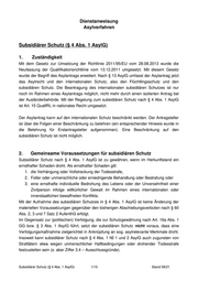 Dienstanweisung Asylverfahren Subsidiärer Schutz (§ 4 Abs. 1 AsylG) 1. Zuständigkeit Mit dem Gesetz zur Umsetzung der Richtlinie 2011/95/EU vom 28.08.2013 wurde die Neufassung der Qualifikationsrichtlinie vom 13.12.2011 umgesetzt. Mit diesem Gesetz wurde der Begriff des Asylantrags erweitert. Nach § 13 AsylG umfasst der Asylantrag jetzt das Asylrecht und den internationalen Schutz, also den Flüchtlingsschutz und den subsidiären Schutz. Die Beantragung des internationalen subsidiären Schutzes ist nur noch im Rahmen eines Asylantrags möglich, nicht mehr durch einen isolierten Antrag bei der Ausländerbehörde. Mit der Regelung zum subsidiären Schutz nach § 4 Abs. 1 AsylG ist Art. 15 QualfRL in nationales Recht umgesetzt. Der Asylantrag kann auf den internationalen Schutz beschränkt werden. Der Antragsteller ist über die Folgen einer Beschränkung zu belehren (ein entsprechender Hinweis wurde in die Belehrung für Erstantragsteller aufgenommen). Eine Beschränkung auf den subsidiären Schutz ist nicht möglich. 2. Gemeinsame Voraussetzungen für subsidiären Schutz Subsidiärer Schutz nach § 4 Abs. 1 AsylG ist zu gewähren, wenn im Herkunftsland ein ernsthafter Schaden droht. Als ernsthafter Schaden gilt: 1. die Verhängung oder Vollstreckung der Todesstrafe, 2. Folter oder unmenschliche oder erniedrigende Behandlung oder Bestrafung oder 3. eine ernsthafte individuelle Bedrohung des Lebens oder der Unversehrtheit einer Zivilperson infolge willkürlicher Gewalt im Rahmen eines internationalen oder innerstaatlichen bewaffneten Konflikts. Mit der Aufnahme des subsidiären Schutzes in § 4 Abs. 1 AsylG ist keine Änderung der materiellen Voraussetzungen gegenüber den bisherigen Abschiebungsverboten nach § 60 Abs. 2, 3 und 7 Satz 2 AufenthG erfolgt. Im Gegensatz zur (politischen) Verfolgung, die zur Schutzgewährung nach Art. 16a Abs. 1 GG bzw. § 3 Abs. 1 AsylG führt, setzt der subsidiären Schutz nicht voraus, dass eine Verfolgungsmaßnahme zielgerichtet in Anknüpfung an sog. asylrelevante Merkmale droht. Insoweit kann subsidiärer Schutz nach § 4 Abs. 1 Nr. 1 und 2 AsylG auch zugunsten von Straftätern etwa wegen unmenschlicher Haftbedingungen oder drohender Todesstrafe festzustellen sein (s. aber Ziffer 3.4 – Ausschlussgründe). Subsidiärer Schutz (§ 4 Abs. 1 AsylG) 1/15 Stand 09/21