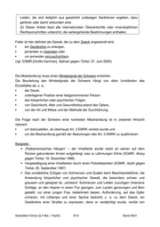 Leiden, die sich lediglich aus gesetzlich zulässigen Sanktionen ergeben, dazu gehören oder damit verbunden sind. (2) Dieser Artikel lässt alle internationalen Übereinkünfte oder innerstaatlichen Rechtsvorschriften unberührt, die weitergehende Bestimmungen enthalten. Folter ist hier definiert als Gewalt, die zu dem Zweck angewandt wird, ein Geständnis zu erlangen, jemanden zu bestrafen oder um jemanden einzuschüchtern (vgl. EGMR [Große Kammer], Salman gegen Türkei, 27. Juni 2000). Die Misshandlung muss einen Mindestgrad der Schwere erreichen. Die Beurteilung des Mindestgrads der Schwere hängt von allen Umständen des Einzelfalles ab, u. a.: der Dauer, unterlegener Position einer festgenommenen Person den körperlichen oder psychischen Folgen, von Geschlecht, Alter und Gesundheitszustand des Opfers, von der Art und Weise und der Methode der Durchführung. Die Frage nach der Schwere einer konkreten Misshandlung ist in zweierlei Hinsicht relevant: um festzustellen, ob überhaupt Art. 3 EMRK verletzt wurde und um die Misshandlung gemäß der Abstufungen des Art. 3 EMRK zu qualifizieren. Beispiele: „Palästinensisches Hängen“ – der Inhaftierte wurde nackt an seinen auf dem Rücken gebundenen Armen aufgehängt, was zu Lähmungen führte (EGMR, Aksoy gegen Türkei, 18. Dezember 1996) Vergewaltigung einer Inhaftierten durch einen Polizeibeamten (EGMR, Aydin gegen Türkei, 25. September 1997) Das vorsätzliche Zufügen von Schmerzen und Qualen beim Beschwerdeführer, die Anwendung körperlicher und psychischer Gewalt, die besonders schwer und grausam und geeignet ist, „schwere” Schmerzen und Leiden zuzufügen (Intensive Schläge, an den Haaren in einen Flur gezogen, zum Laufen gezwungen und Bein gestellt, vor einer jungen Frau niederknien lassen, Aufforderung, auf das Opfer urinieren, mit Lötlampe und einer Spritze bedroht) u. a. zu dem Zweck, ein Geständnis einer Straftat zu erpressen, derer er verdächtigt wurde, verübt von Subsidiärer Schutz (§ 4 Abs. 1 AsylG) 8/15 Stand 09/21