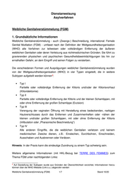 Dienstanweisung Asylverfahren Weibliche Genitalverstümmelung (FGM) 1. Grundsätzliche Informationen Weibliche Genitalverstümmelung - auch (Zwangs-) Beschneidung, international: Female Genital Mutilation (FGM) - umfasst nach der Definition der Weltgesundheitsorganisation (WHO) alle Verfahren zur teilweisen oder vollständigen Entfernung der äußeren weiblichen Genitalien oder deren Verletzung aus nichtmedizinischen Gründen. Sie führt zu gravierenden physischen und psychischen Gesundheitsbeeinträchtigungen bis hin zur ernsthaften Gefahr, an dem Eingriff und seinen Folgen zu versterben. Die verschiedenen Formen und Ausprägungen weiblicher Genitalverstümmelung wurden von der Weltgesundheitsorganisation (WHO) in vier Typen eingeteilt, die in weitere 0 Subtypen aufgeteilt werden können : Typ I Partielle oder vollständige Entfernung der Klitoris und/oder der Klitorisvorhaut (Klitoridektomie) Typ II Partielle oder vollständige Entfernung der Klitoris und der kleinen Schamlippen, mit oder ohne Entfernung der großen Schamlippe (Exzision) Typ III Verengung der vaginalen Öffnung mit Herstellung eines bedeckenden, narbigen Hautverschlusses durch das Entfernen und Zusammenheften oder -nähen der kleinen und/oder großen Schamlippen, mit oder ohne Entfernung der Klitoris (Infibulation oder „Pharaonische Beschneidung“) Typ IV Alle anderen Eingriffe, die die weiblichen Genitalien verletzen und keinem medizinischen Zwecke dienen, z.B.: Einstechen, Durchbohren, Einschneiden, Ausschaben und Ausbrennen oder Verätzen. Hinweis: In der Praxis kann die eindeutige Zuordnung zu einem Typ schwierig sein. Weitere allgemeine Informationen (mit HKL-Bezug bei TERRE DES FEMMES) zum Thema FGM unter nachfolgenden Links: 0 Auf Darstellung der Subtypen wurde aus Gründen der Übersichtlichkeit verzichtet, Informationen hierzu können über die WHO-Website (Link s.u.) abgerufen werden Weibliche Genitalverstümmelung (FGM) 1/7 Stand 10/20