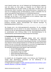 erneut überprüft werden kann, da der Fortbestand des Flüchtlingsschutzes spätestens nach drei Jahren von Amts wegen zu überprüfen ist; ein Widerruf kann die Aufenthaltsbeendigung für die ganze Familie zur Folge haben. Die Eltern sind in der Anhörung ferner darauf hinzuweisen, dass Genitalverstümmelung in Deutschland auch wenn sie mit Einwilligung erfolgt, als Körperverletzung, zumeist in verschärfter Form als schwere oder gefährliche Körperverletzung, mit Freiheitsstrafe bestraft wird. Dem Bescheid, mit dem Flüchtlingsschutz zuerkannt wird, ist ein Informationsblatt beizufügen, das die Eltern in ihrer Heimatsprache auf die rechtlichen Folgen einer nachträglichen Genitalverstümmelung hinweist. Hinweis: Im Rahmen des Bescheidzustellungsauftrages ist dem AVS in Form einer Verfügung mitzuteilen, welches Informationsblatt dem Bescheid beizufügen ist (Dokumentennummern D1132-D1144). Die Hinweise sind in die Anhörungsniederschrift aufzunehmen. Für die zuständige Ausländerbehörde sind die Gründe für die positive Entscheidung und die erfolgten Hinweise aus dem der Bescheidausfertigung beigefügten Anhörungsprotokoll erkennbar. Ist ausnahmsweise keine Anhörung erfolgt, ist der Bescheidausfertigung für die Ausländerbehörde ausnahmsweise der Begründungsvermerk beizufügen. 6. Fachärztliche Bescheinigungen Grundsätzlich ist bei einem glaubhaften Vortrag (siehe auch ergänzende Verfahrenshinweise unter Ziff. 5.2.1.4) zu einer stattgefundenen oder drohenden Genitalverstümmelung eine fachärztliche Bescheinigung einzuholen. Die Bescheinigung einer Hebamme reicht als alleiniger Nachweis für eine FGM (oder die Nichtvornahme einer solchen) nicht aus, ihr kommt aber Indizcharakter zu und sie kann Grundlage/Auslöser für die Einholung einer abschließenden fachärztlichen Bescheinigung sein. Die fachärztliche Bescheinigung sollte folgende Fragen beantworten: Hat eine FGM stattgefunden? Welcher Typ FGM nach WHO liegt vor? Gesundheitliche Folgen der FGM? Welcher Behandlungsbedarf besteht? Welche Folgen hätte ggf. eine Nichtbehandlung? Es empfiehlt sich, die Antragstellerin bereits in der Anhörung unter Fristsetzung zur Vorlage dieser Bescheinigung aufzufordern und die Aufforderung in der Anhörungsniederschrift zu protokollieren. Im Übrigen gelten die Vorgaben im Kapitel „Abschiebungsverbote nach § 60 Abs. 5 und 7 AufenthG, Abschnitt 1.3 "§ 60 Abs.7 AufenthG“. Weibliche Genitalverstümmelung (FGM) 6/7 Stand 10/20