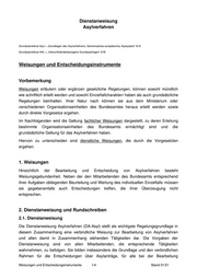 Dienstanweisung Asylverfahren Grundsatzreferat Asyl = „Grundlagen des Asylverfahrens, Gemeinsames europäisches Asylsystem“ 61A Grundsatzreferat HKL = „Herkunftsländerbezogene Grundsatzfragen“ 61B Weisungen und Entscheidungsinstrumente Vorbemerkung Weisungen erläutern oder ergänzen gesetzliche Regelungen, können sowohl mündlich wie schriftlich erteilt werden und sowohl Einzelfallcharakterr haben als auch grundsätzliche Regelungen beinhalten. Ihrer Natur nach können sie aus dem Ministerium oder verschiedenen Organisationseinheiten des Bundesamtes heraus erteilt werden sowie durch direkte Vorgesetze ergehen. Im Nachfolgenden wird die Geltung fachlicher Weisungen dargestellt, zu deren Erteilung bestimmte Organisationseinheiten des Bundesamts ermächtigt sind und die grundsätzliche Geltung für das Asylverfahren haben. Hiervon zu unterscheiden sind dienstliche Weisungen, die durch die Vorgesetzten ergehen. 1. Weisungen Hinsichtlich der Bearbeitung und Entscheidung von Asylverfahren besteht Weisungsgebundenheit. Neben der den Mitarbeitenden des Bundesamts entsprechend ihrer Aufgaben obliegenden Beurteilung und Wertung des individuellen Einzelfalls müssen sie gegebenenfalls auch Entscheidungen treffen, die ihrer Überzeugung nicht entsprechen. 2. Dienstanweisung und Rundschreiben 2.1. Dienstanweisung Die Dienstanweisung Asylverfahren (DA-Asyl) stellt als wichtigste Regelungsgrundlage in diesem Zusammenhang eine verbindliche Weisung zur Bearbeitung von Asylverfahren und allen damit in Zusammenhang stehenden Tätigkeiten dar. Die Vorgaben der Dienstanweisung sind von allen Mitarbeitenden, die entsprechende Tätigkeiten wahrnehmen, zu befolgen. Sie bilden insbesondere die Grundlage und den verbindlichen Rahmen für die Entscheidungen über Asylanträge, für alle bei der Bearbeitung Weisungen und Entscheidungsinstrumente 1/4 Stand 01/21