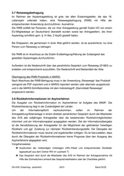 3.7 Reisewegsbefragung Im Rahmen der Asylantragstellung ist grds. bei allen Erstantragsteller, die das 18. Lebensjahr vollendet haben, eine Reisewegsbefragung (RWB) mit Hilfe der entsprechenden Anwendung durchzuführen. Ausnahme: Die RWB entfällt bei Personen, die vor ihrer Antragstellung gemäß Dublin-VO von einem EU-Mitgliedstaat an Deutschland überstellt wurden sowie bei Antragstellern, die ihren Asylantrag schriftlich gem. § 14 Abs. 2 AsylG gestellt haben. Bei Ehepaaren, die gemeinsam in einer Akte geführt werden, ist es ausreichend, nur eine Person zum Reiseweg zu befragen. Die RWB ist im Anschluss an die Dublin-Erstbefragung/Klärung der Zulässigkeit des gestellten Asylantrages durchzuführen. Außerdem ist die Niederschrift über das persönliche Gespräch zum Reiseweg (D1663) zu erstellen und entsprechend auszufüllen. Die Niederschrift wird Bestandteil der Akte. Übertragung des RWB-Protokolls in MARiS: Nach Abschluss der RWB-Befragung muss in der Anwendung „Reisewege“ das Protokoll zwingend als PDF exportiert und in MARiS importiert werden oder alternativ ausgedruckt und in die MARiS-Schriftstückliste mit dem Indizierbegriff „Stammblatt-Reisewege“ eingescannt werden. 3.8 Rückkehrinformationen im Asylverfahren Die Ausgabe von Rückkehrinformation im Asylverfahren ist Aufgabe des BAMF. Die Rückkehrberatung liegt in der Zuständigkeit der Länder. Um der Informationspflicht nachzukommen, sollen im Rahmen der Antragstellung/Aktenanlage in einem direkten persönlichen Gespräch durch die Mitarbeiter des AVS alle volljährigen Antragsteller über die bestehenden Rückkehrmöglichkeiten informiert und ein Informationspaket ausgegeben werden. Ziel der Informationsübergabe ist die Sensibilisierung der Antragsteller für die Möglichkeit der geförderten freiwilligen Rückkehr und ggf. Zuleitung zur nächsten Rückkehrberatungsstelle. Die Übergabe der Rückkehrinformationen muss neutral und ergebnisoffen erfolgen. Es ist klarzustellen, dass durch die Übergabe der Rückkehrinformationen keine Prognose über den Ausgang des Asylverfahrens abgegeben wird. Vorgehensweise: Ausdrucken der notwendigen Unterlagen (HKL-Paket und entsprechendes Deckblatt, tagesaktuell aus dem Ordner RKI im Laufwerk T) Das Gespräch wird durch die Mitarbeiter des AVS im Rahmen der Antragsannahme mit Hilfe des Dolmetschers anhand des Gesprächsleitfadens oder der Checkliste geführt. DA-AVS: Erstantrag - persönlich 24/31 Stand 03/22