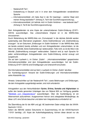 - Niederschrift Teil I - Erstbelehrung in Deutsch und in in einer dem Antragstellenden verständlichen Sprache. - Informationsmerkblatt „Ich habe Asyl in der EU beantragt – welcher Staat wird meinen Antrag bearbeiten?“ (Anhang X, Teil A der Durchführungsverordnung),. - Informationsmerkblatt „Ich befinde mich im Dublin-Verfahren – was bedeutet das?“ (Anhang X, Teil B der Durchführungsverordnung). Dem Antragstellenden ist eine Kopie der unterschriebenen Dublin-Erklärung (D1971- D2016) auszuhändigen. Das unterschriebene Original ist in die MARiS-Akte einzuscannen. Durch Weiterleitung der MARiS-Akte von „Formularsatz“ in die nächste Aktivität werden systemseitig zwei Alternativen angeboten: „Keine Dublinerklärung“ und „Dublinerklärung erzeugen“. Ist ein Dokument „Erklärungen im Dublin-Verfahren“ in der MARiS-Akte (falls sie bereits existiert) bereits enthalten und vom Antragstellenden unterschrieben, ist die Akte in die Aktivität „Keine Dublinerklärung“ weiterzuleiten. Falls nicht, so ist die Akte in die Aktivität „Dublinerklärung erzeugen“ weiterzuleiten. Dadurch wird je nach Sprache für jeden verfahrensfähigen Antragstellenden eine Dublin-Erklärung einmal erzeugt und ausgedruckt. Die auf dem Laufwerk L, im Ordner „Dublin“ - „Informationsmerkblätter“ gespeicherten Informationsmerkblätter sind dem Antragstellenden auszuhändigen. Auf der Dublin- Erklärung (D1971-D2016) sind Einwilligungen und Unterschrift einzuholen. Die Informationsmerkblätter sind auf dem L-Laufwerk im Ordner „Dublin“ abrufbar. Zur Aushändigung/zum Versand der Dublin-Erklärungen und Informationsmerkblätter siehe Arbeitshilfe hier. Hinweis: Unterschriften auf der Niederschrift Teil I, sowie Belehrungen und Erklärungen, die dem Antragsteller ausgehändigt werden, sind nicht erforderlich. Antragstellern aus den Herkunftsländern Syrien, Eritrea, Somalia und Afghanistan ist außer den bereits genannten Unterlagen das von Referat 82A zur Verfügung gestellte "Merkblatt zum Integrationskurs" auszuhändigen. Über die Aushändigung ist ein Aktenvermerk aufzunehmen. Ausgenommen hiervon sind unbegleitete Minderjährige, da diese i.d.R. eine Schule besuchen und daher kein Integrationskurs erforderlich ist.“ Die Übermittlung der für die ABH und ggf. AE bestimmten Daten erfolgt über die XAVIA- Nachricht 110101. Sofern die ABH/AE weitere Dokumente im Zusammenhang mit der XAVIA-Nachricht 110101 benötigt, z.B. Kopie der Aufenthaltsgestattung, können diese derzeit nur als DA-AVS: Erstantrag - persönlich 31/31 Stand 03/22