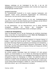 Anhörung, unabhängig von der Zuständigkeit für das HKL, in der der JVA nächstgelegenen AS des Bundesamtes bearbeitet, sofern innerhalb einer Gruppe keine Sonderregelungen vereinbart wurden. Sonderfall Frankfurt/Flgh: Die Transitaußenstelle Frankfurt/M ist für bereits eingereiste Asylbewerber nicht zugänglich. Insofern können administrative Begleitaufgaben wie ed-Behandlung, Anhörung usw. nicht durch die AS Frankfurt durchgeführt werden. Von daher ist die Außenstelle Frankfurt von der grds. Zuständigkeitsregelung ausgenommen, wonach für die weitere Bearbeitung die AS zuständig ist, die dem Wohnort des Antragstellers am nächsten liegt und die das HKL bearbeitet. Für den Südhessischen- und den Rhein-Main-Raum sind für bereits eingereiste Antragsteller, abhängig vom Wohnort des Antragstellers, die Ankunftszentren/Dependancen/Außenstellen Gießen und Büdingen zuständig. 3. Datum der Antragstellung Sofern die Aktenanlage nicht am Tag des Posteingangs des schriftlichen Asylantrages erfolgt, ist das Datum der Asylantragstellung mit dem Datum des Posteingangs des schriftlichen Asylantrages beim Bundesamt einzugeben. Hinweis: Die Umprotokollierung hat regelmäßig spätestens am folgenden Werktag zu erfolgen. In jedem Fall ist die Frist des Art. 6 Abs. 1 Verfahrensrichtlinie 2013/32/EU einzuhalten Aktenanlage (Registrierung) spätestens drei Arbeitstage nach Antragstellung. Es ist daher vor Ort durch organisatorische Maßnahmen sicherzustellen, dass die Aktenanlage regelmäßig spätestens am folgenden Werktag nach Eingang des schriftlich gestellten Asylantrages erfolgt. 4. Datum der Ersteinreise Bei schriftlich gestellten Asylanträgen liegen dem Bundesamt i.d.R. keine genauen Angaben zum Ersteinreisedatum vor. Ist im Rahmen der Aktenanlage das tatsächliche Datum der Ersteinreise nicht bekannt, ist als vorläufiges Ersteinreisedatum das Datum der Antragstellung (Datum des Posteingangs) zu erfassen. Das tatsächliche Datum der Ersteinreise ist entweder durch Nachfrage bei der zuständigen ABH oder im Rahmen der Anhörung zu ermitteln. Konnte das tatsächliche Datum der Ersteinreise ermittelt werden, ist das vorläufig erfasste Einreisedatum in MARiS und - sofern die Erstmeldung durch die ABH bereits erfolgt ist - ggf. im AZR entsprechend zu korrigieren. Erstantrag – schriftlich 4/8 Stand 03/22