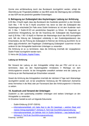 Konnte eine ed-Behandlung durch das Bundesamt durchgeführt werden, erfolgt die Übermittlung der Fingerabdruckblätter an das BKA sowie die Übertragung des Lichtbildes an das AZR wie bei persönlich gestellten Erstanträgen. 9. Befragung zur Zulässigkeit des Asylantrages/ Ladung zur Anhörung § 29 Abs. 2 AsylG regelt, dass das Bundesamt den Ausländer persönlich zu den Gründen nach Abs. 1 Nr. 1b bis 5 AsylG anzuhören hat, bevor es über die Zulässigkeit des Asylantrages entscheidet. Im Falle eines Dublin-Verfahrens ist mit dem Ausländer nach Art. 5 Abs. 1 Dublin-III-VO ein persönliches Gespräch zu führen. Im Gegensatz zur persönlichen Antragstellung, bei der die Vorprüfung der Zulässigkeit des Asylantrages nach § 29 Abs. 1 Nr. 1-5 AsylG im Rahmen der Aktenanlage durch das AVS durchgeführt wird, fällt die Klärung der Zulässigkeit vollständig in den Zuständigkeitsbereich des Entscheiders, der die Prüfung der Zulässigkeit im Rahmen der Anhörung durchführt. Es ist daher nicht erforderlich, den Fragebogen „Erstbefragung Zulässigkeit“ zusammen mit den anderen für den Antragsteller bestimmten Unterlagen zu versenden. Die Anhörung ist so zu terminieren, dass die Anhörung innerhalb der vorgegebenen Dublin-Fristen durchgeführt werden kann. S. hierzu die DA Dublin, Kapitel Fristen. Ladung zur Anhörung Bei Versand der Ladung an den Antragsteller erfolgt dies per PZU und ist so zu terminieren, dass sie den Asylantragsteller mindestens 4 Werktage vor dem Anhörungstermin erreicht. Ist der Antragsteller anwaltlich vertreten wird die Ladung zur Anhörung an den Rechtsanwalt per Einschreiben versandt. Soweit die Anhörung des Antragstellers innerhalb der nächsten 6 Tage nach Aktenanlage durchgeführt werden soll, ist bei anwaltlicher Vertretung der RA telefonisch (Aufnahme eines Vermerkes in die Akte) oder per Faxversand über den Anhörungstermin in Kenntnis zu setzen. 10. Ausdruck und Versand der Unterlagen Zusätzlich zu den systemseitig erstellten Unterlagen sind weitere Unterlagen an den Antragsteller zu versenden. Im Einzelnen handelt es sich um folgende Dokumente: - Dublin-Erklärung (D1971-D2016). - Informationsmerkblatt „Ich habe Asyl in der EU beantragt – welcher Staat wird meinen Antrag bearbeiten?“ (Anhang X, Teil A der Durchführungsverordnung), - Informationsmerkblatt „Ich befinde mich im Dublin-Verfahren – was bedeutet das?“ (Anhang X, Teil B der Durchführungsverordnung). Erstantrag – schriftlich 6/8 Stand 03/22