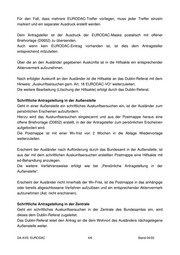 Für den Fall, dass mehrere EURODAC-Treffer vorliegen, muss jeder Treffer einzeln markiert und ein separater Ausdruck erstellt werden. Dem Antragsteller ist der Ausdruck der EURODAC-Maske postalisch mit offener Briefvorlage (D0652) zu übersenden. Auch wenn kein EURODAC-Eintrag vorhanden ist, ist dies dem Antragsteller entsprechend mitzuteilen. Über die an den Ausländer gegebenen Auskünfte ist in die Hilfsakte ein entsprechender Aktenvermerk aufzunehmen. Nach erfolgter Auskunft an den Ausländer ist die Hilfsakte an das Dublin-Referat mit dem Hinweis: „Auskunftsersuchen gem. Art. 18 EURODAC-VO“ weiterzuleiten. Die weitere Bearbeitung (Löschung der Hilfsakte) erfolgt durch das Dublin-Referat. Schriftliche Antragstellung in der Außenstelle Geht in einer Außenstelle ein schriftliches Auskunftsersuchen ein, ist der Ausländer zum persönlichen Erscheinen aufzufordern. Hierzu wird das Auskunftsersuchen eingescannt und aus der Postmappe heraus eine offene Briefvorlage (D0652) erstellt, in der der Antragsteller zum persönlichen Erscheinen aufgefordert wird. Die Postmappe ist mit einer Wv-frist von 2 Wochen in die Ablage Wiedervorlage weiterzuleiten. Erscheint der Ausländer nach Aufforderung durch das Bundesamt in der Außenstelle, ist aus der mit dem schriftlichen Auskunftsersuchen erstellten Postmappe eine Hilfsakte mit ed-Behandlung anzulegen. Die weitere Verfahrensweise erfolgt wie bei „Persönliche Antragstellung in der Außenstelle“. Erscheint der Ausländer nicht innerhalb der Wv-Frist, ist die Postmappe in das anhängige oder bereits abgeschlossene Verfahren aufzulösen und ein entsprechender Aktenvermerk aufzunehmen (Ast. nicht erschienen). Schriftliche Antragstellung in der Zentrale Geht ein schriftliches Auskunftsersuchen in der Zentrale des Bundesamtes ein, wird dieses dem Dublin-Referat zugeleitet. Das Dublin-Referat leitet den Antrag an die dem Wohnort des Ausländers nächsgelegene Außenstelle weiter. DA-AVS: EURODAC 4/6 Stand 04/22