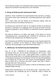 Nach Eingang des Antrages in der Außenstelle erfolgt die weitere Verfahrensweise wie bei Eingang eines schriftlichen Auskunftsersuchens in der Außenstelle. 5. Antrag auf Änderung oder Löschung der Daten Gemäß Art. 18 Abs. 3 EURODAC-VO hat jede betroffene Person das Recht zu verlangen, dass sachlich falsche Daten berichtigt oder unrechtmäßig gespeicherte Daten gelöscht werden. Auch in diesen Fällen wird eine Hilfsakte mit ed Behandlung angelegt, wobei das persönliche Erscheinen des Ausländers erforderlich ist. Die Änderung oder Löschung der Daten ist vom Ausländer schriftlich bei persönlichem Erscheinen zu beantragen und zu begründen, sofern der Antrag nicht bereits vorab beim Bundesamt eingegangen ist und der Ausländer zum persönlichen Erscheinen aufgefordert wurde. Bei Anlage der Hilfsakte ist in der Maske „Akte Details“ im Feld „Betreff“ der Vermerk „Änderungsantrag bzw. Löschungsantrag gem. EURODAC-VO“ aufzunehmen und der schriftliche Antrag mit Begründung in die Hilfsakte einzuscannen. Nach Rückmeldung der EURODAC-Rechercheergebnisse ist das Fingerabdruckblatt beim Bundesamt zu vernichten und die Hilfsakte zur weiteren Bearbeitung (Prüfung des Änderungs-/Löschungsantrages) an das Dublin-Referat weiterzuleiten. 6. „Markierung“ bei Anerkennung des Asylbewerbers Gem. Art. 18 Abs. 1 EURODAC-VO sind Datensätze von Asylbewerbern, denen internationaler Schutz (Art. 16a GG und/oder Flüchtlingsschutz nach § 3 Abs. 1 AsylG oder subsidiärer Schutz nach § 4 Abs. 1 AsylG) gewährt wurde, zu „markieren“. Diese Markierung wird gemäß Artikel 12 für Datenübermittlungszwecke nach Artikel 9 Absatz 5 im Zentralsystem gespeichert. Das Zentralsystem informiert alle Herkunftsmitgliedstaaten über die Markierung von Daten durch einen anderen Herkunftsmitgliedstaat, nachdem dieser mit Daten, die er zu Personen nach Artikel 9 Absatz 1oder Artikel 14 Absatz 1 übermittelt hatte, einen Treffer erzielt hat. Die Markierung wird bei Abschluss des Verfahren im Rahmen der Weiterleitung in die BK- Ablage/RK-Ablage veranlasst. Werden positive Entscheidungen zu Art. 16a GG oder § 3 Abs. 1 AsylG oder § 4 Abs. 1 AsylG bestands- oder rechtskräftig (gilt auch für Teil-BK/RK), erfolgt im Rahmen der DA-AVS: EURODAC 5/6 Stand 04/22