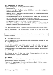 3.4.6 Aushändigung von Unterlagen Folgende Unterlagen sind dem Antragsteller auszuhändigen: - Niederschrift Teil I - Belehrung nach § 10 AsylG auf Deutsch (D0195) und in einer dem Antragsteller verständlichen Fremdsprache - Belehrung nach § 14 Abs. 1 AsylG auf Deutsch (D0696) und in einer dem Antragsteller verständlichen Fremdsprache - Folgeantragsbestätigung für den Antragsteller mit dem Hinweis, dass sich dieser bei der für ihn zuständigen ABH zwecks Wohnsitznahme zu melden hat - Informationsmerkblatt „Ich habe Asyl in der EU beantragt – welcher Staat wird meinen Antrag bearbeiten?“ (Anhang X, Teil A der Durchführungsverordnung) - Informationsmerkblatt „Ich befinde mich im Dublin-Verfahren – was bedeutet das?“ (Anhang X, Teil B der Durchführungsverordnung) Dem Antragstellenden ist eine Kopie der unterschriebenen Dublin-Erklärung (D1971- D2016) auszuhändigen. Das unterschriebene Original ist in die MARiS-Akte einzuscannen. Hinweis: Unterschriften auf den Dokumenten die dem Antragsteller ausgehändigt werden, sind nicht erforderlich. 3.4.7 Versand der Unterlagen ABH und AE werden mit XAVIA-Nachricht 110103 bei Weiterleitung in „Weiter an EE“ über die Antragstellung informiert. Hinweis: Sollen zusätzlich zu der XAVIA-Nachricht 110103 mehr als 2 Dokumente als Einzelfallinformation an die ABH übermittelt werden, sind diese per XAVIA- Einzelfallinformation 110501 aus der MARiS-Schriftstückliste heraus zu versenden (max. bis zu 4 Anhänge). Die Mitteilung an den RA über die erfolgte Folgeantragstellung wird auf dem Postausgangsdrucker ausgedruckt und versandt. 3.4.8 Scannen Grundsätzlich sind sämtliche im Rahmen der Antragsentgegennahme erhaltenen und ausgehändigten Unterlagen einzuscannen. Ausnahme: Die ausgehändigten Informationsmerkblätter zum Dublin-Verfahren müssen nicht in die MARiS Akte eingescannt werden. DA-AVS: Folgeantrag - schriftlich 12/12 Stand 02/22