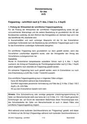 Dienstanweisung für das AVS Folgeantrag – schriftlich nach § 71 Abs. 2 Satz 3 u. 4 AsylG 1. Prüfung der Wirksamkeit der schriftlichen Folgeantragstellung Für die Prüfung der Wirksamkeit der schriftlichen Folgeantragstellung sowie die ggf. vorzunehmende Aktenanlage und die weitere Bearbeitung ist grundsätzlich die AS des Bundesamtes zuständig, die dem Wohnort des Antragstellers am nächsten liegt und in der das betreffende HKL bearbeitet wird. In Ausnahmefällen und nach vorheriger Absprache mit der für das Erstverfahren zuständigen Außenstelle kann die Bearbeitung des schriftlichen Folgeantrages auch in der für das Erstverfahren zuständigen Außenstelle übergehen. Ein schriftlicher Folgeantrag kann grundsätzlich nur dann gestellt werden, wenn das Vorverfahren unanfechtbar abgelehnt wurde, oder der Antragsteller den Antrag des Vorverfahrens zurückgenommen hat. Ausnahme: Wurde im Erstverfahren beispielsweise subsidiärer Schutz nach § 4 Abs. 1 AsylG zuerkannt, der Antrag auf Feststellung der Flüchtlingseigenschaften nach § 3 Abs. 1 AsylG jedoch abgelehnt, kann ebenfalls ein Folgeantrag gestellt werden. Ein wirksamer Folgeantrag kann auch gestellt werden, wenn im Erstverfahren nur noch eine Entscheidung zu § 60 Abs. 5 oder 7 AufenthG aussteht. Eine schriftliche Folgeantragstellung kann in folgenden Fällen erfolgen: - Keine AE-Wohnpflicht während des Erstverfahrens. - Schriftlich begründete persönliche Verhinderung und Fälle des § 14 Abs. 2 Satz 1 Nr. 2 AsylG, z.B. JVA-Fälle. - AS aus dem Erstverfahren besteht nicht mehr. Hinweis: Eine Schutzwohnung oder sonstige geeignete Unterbringungseinrichtung für Opfer von Menschenhandel stellt zwar keine der in § 14 Abs. 2 S. 1 Nr. 2 AsylG genannten Einrichtungen dar, auf Grund der besonderen Bedürfnisse dieser Personengruppe bzw. des Schutzbedarfes der Opfer von Menschenhandel ist auch in diesen Fällen eine schriftliche Folgeantragstellung möglich. Wird während eines laufenden Gerichtsverfahrens ein "Folgeantrag" gestellt, wird dieser im Hinblick auf die DA-Asyl (Folgeanträge während noch laufenden Gerichtsverfahrens) in DA-AVS: Folgeantrag - schriftlich 1/12 Stand 02/22