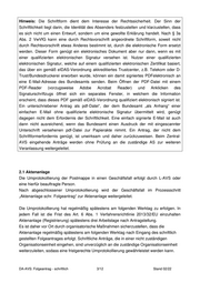 Hinweis: Die Schriftform dient dem Interesse der Rechtssicherheit. Der Sinn der Schriftlichkeit liegt darin, die Identität des Absenders festzustellen und klarzustellen, dass es sich nicht um einen Entwurf, sondern um eine gewollte Erklärung handelt. Nach § 3a Abs. 2 VwVfG kann eine durch Rechtsvorschrift angeordnete Schriftform, soweit nicht durch Rechtsvorschrift etwas Anderes bestimmt ist, durch die elektronische Form ersetzt werden. Dieser Form genügt ein elektronisches Dokument aber nur dann, wenn es mit einer qualifizierten elektronischen Signatur versehen ist. Nutzer einer qualifizierten elektronischen Signatur, welche auf einem qualifizierten elektronischen Zertifikat basiert, das über ein gemäß eIDAS-Verordnung akkreditiertes Trustcenter, z.B. Telekom oder D- Trust/Bundesdruckerei erworben wurde, können ein damit signiertes PDFelektronisch an eine E-Mail-Adresse des Bundesamts senden. Beim Öffnen der PDF-Datei mit einem PDF-Reader (vorzugsweise Adobe Acrobat Reader) und Anklicken des Signaturschriftzugs öffnet sich ein separates Fenster, in welchem die Information erscheint, dass dieses PDF gemäß eIDAS-Verordnung qualifiziert elektronisch signiert ist. Ein unterschriebener Antrag als pdf-Datei“, der dem Bundesamt „als Anhang“ einer einfachen E-Mail ohne qualifizierte elektronische Signatur übermittelt wird, genügt dagegen nicht dem Erfordernis der Schriftlichkeit. Eine einfach signierte E-Mail ist auch dann nicht ausreichend, wenn das Bundesamt einen Ausdruck der mit eingescannter Unterschrift versehenen pdf-Datei zur Papierakte nimmt. Ein Antrag, der nicht dem Schriftformerfordernis genügt, ist unwirksam und daher zurückzuweisen. Beim Zentral- AVS eingehende Anträge werden ohne Prüfung an die zuständige AS zur weiteren Veranlassung weitergeleitet. 2.1 Aktenanlage Die Umprotokollierung der Postmappe in einen Geschäftsfall erfolgt durch L-AVS oder eine hierfür beauftragte Person. Nach abgeschlossener Umprotokollierung wird der Geschäftsfall im Prozessschritt „Aktenanlage schr. Folgeantrag“ zur Aktenanlage weitergeleitet. Die Umprotokollierung hat regelmäßig spätestens am folgenden Werktag zu erfolgen. In jedem Fall ist die Frist des Art. 6 Abs. 1 Verfahrensrichtlinie 2013/32/EU einzuhalten Aktenanlage (Registrierung) spätestens drei Arbeitstage nach Antragstellung. Es ist daher vor Ort durch organisatorische Maßnahmen sicherzustellen, dass die Aktenanlage regelmäßig spätestens am folgenden Werktag nach Eingang des schriftlich gestellten Folgeantrages erfolgt. Schriftliche Anträge, die in einer nicht zuständigen Organisationseinheit eingehen, sind unverzüglich an die zuständige Organisationseinheit weiterzuleiten, sodass eine fristgerechte Umprotokollierung gewährleistet werden kann. DA-AVS: Folgeantrag - schriftlich 3/12 Stand 02/22