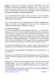 Hinweis: Im Gegensatz zur Aktenanlage bei persönlicher Antragstellung darf der nach erfolgreicher Personensuche gefundenen Antragsteller nicht in eine „neue Akte“ übernommen werden, sondern ist aus dem Vorverfahren über das "Kontextmenü zur Person" in die Postmappe zu übernehmen. Die Postmappe muss hierzu im Hintergrund in der Aktivität "Aktenanlage schr. Folgeantrag" geöffnet sein. Bei der Verfahrensauswahl ist darauf zu achten, ob es sich um einen unbegrenzten Folgeantrag oder einen auf die Feststellung der Flüchtlingseigenschaften nach § 3 Abs. 1 AsylG begrenzten Antrag handelt. Sofern die Aktenanlage nicht am Posteingangstag des schriftlichen Asylfolgeantrages erfolgt, ist das Datum der Antragstellung mit dem Datum des Posteingangs des schriftlichen Asylfolgeantrages beim Bundesamt einzugeben. 2.2 Versand der Unterlagen Die für den Antragsteller bestimmten Unterlagen (Niederschrift, § 10 Belehrungen, Belehrungen nach § 14 Abs. 1 Satz 2 (D0696), Informationsmerkblätter „Ich habe Asyl in der EU beantragt – welcher Staat wird meinen Antrag bearbeiten“ (Anhang X, Teil A der Dublin-Durchführungsverordnung) und „Ich befinde mich im Dublin-Verfahren – was bedeutet das?“ (Anhang X, Teil B der Dublin-Durchführungsverordnung), Dublin-Erklärung (D1971-D2016), Folgeantragsbestätigung Ast - D0196) werden mit dem Anschreiben D1440 (DÜ_schrftl_Vf_BriefAst) per PZU übersandt. Wird der Antragsteller anwaltlich vertreten, ist an diesen mit Anschreiben D1434 (DÜ_schrftl_Vf_BriefRA) zuzustellen. Die Informationsmerkblätter sind auf dem L-Laufwerk im Ordner „Dublin“ abrufbar. Zur Aushändigung von Dublin-Erklärungen und Informationsmerkblätter siehe Arbeitshilfe hier. Eine Unterschrift des aktenanlegenden AVS-Mitarbeiters auf der Niederschrift Teil I ist nicht erforderlich. Die Mitteilung an die ABH über die erfolgte Folgeantragstellung wird bei Weiterleitung an den SB in „Schriftlicher Folgeantrag“ über XAVIA-Nachricht 110103 (Folgeantragstellung) versandt. Hinweis: Sollen zusätzlich zu der XAVIA-Nachricht 110103 mehr als 2 Dokumente als Einzelfallinformation an die ABH übermittelt werden, sind diese per XAVIA- Einzelfallinformation 110501 aus der MARiS-Schriftstückliste heraus zu versenden (max. bis zu 4 Anhänge). Im Zusammenhang mit der Übermittlung von XAVIA-Nachrichten sind der Leitfaden XAVIA sowie die Kurzübersicht XAusländer zu beachten. DA-AVS: Folgeantrag - schriftlich 4/12 Stand 02/22