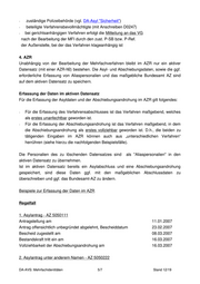 - zuständige Polizeibehörde (vgl. DA-Asyl "Sicherheit") - beteiligte Verfahrensbevollmächtigte (mit Anschreiben D0247) - bei gerichtsanhängigen Verfahren erfolgt die Mitteilung an das VG nach der Bearbeitung der MFI durch den zust. P-SB bzw. P-Ref. der Außenstelle, bei der das Verfahren klageanhängig ist 4. AZR Unabhängig von der Bearbeitung der Mehrfachverfahren bleibt im AZR nur ein aktiver Datensatz (mit einer AZR-Nr.) bestehen. Die Asyl- und Abschiebungsdaten, sowie die ggf. erforderliche Erfassung von Aliaspersonalien und das maßgebliche Bundesamt AZ sind auf dem aktiven Datensatz zu speichern. Erfassung der Daten im aktiven Datensatz Für die Erfassung der Asyldaten und der Abschiebungsandrohung im AZR gilt folgendes: - Für die Erfassung des Verfahrensabschlusses ist das Verfahren maßgebend, welches als erstes unanfechtbar geworden ist. - Für die Erfassung der Abschiebungsandrohung ist das Verfahren maßgebend, in dem die Abschiebungsandrohung als erstes vollziehbar geworden ist. D.h., die beiden zu tätigenden Eingaben im AZR können auch aus „unterschiedlichen Verfahren“ herrühren (siehe hierzu die nachfolgenden Beispielsfälle). Die Personalien des zu löschenden Datensatzes sind als "Aliaspersonalien" in den aktiven Datensatz zu übernehmen. Ist im aktiven Datensatz bereits ein Asylabschluss und eine Abschiebungsandrohung gespeichert, sind diese Daten ggf. mit den maßgeblichen Abschlussdaten zu überschreiben und ggf. das Bundesamt-AZ zu ändern. Beispiele zur Erfassung der Daten im AZR Regelfall 1. Asylantrag - AZ 5050111 Antragstellung am 11.01.2007 Antrag offensichtlich unbegründet abgelehnt, Bescheiddatum 23.02.2007 Bescheid zugestellt am 08.03.2007 Bestandskraft tritt ein am 16.03.2007 Vollziehbarkeit der Abschiebungsandrohung am 16.03.2007 2. Asylantrag unter anderem Namen - AZ 5050222 DA-AVS: Mehrfachidentitäten 5/7 Stand 12/19
