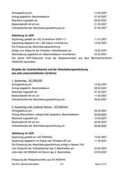 Antragstellung am 14.02.2007 Antrag abgelehnt, Bescheiddatum 27.02.2007 Bescheid zugestellt am 06.03.2007 Bestandskraft tritt ein am 21.03.2007 Vollziehbarkeit der Abschiebungsandrohung am 07.04.2007 Abbildung im AZR: Asylantrag gestellt am (AZ Urverfahren 5050111) 11.01.2007 Asylantrag abgelehnt am ( BK-Datum Urverfahren) 16.03.2007 Die Erfassung der Abschiebungsandrohung erfolgt zum Zeitpunkt der frühesten Vollziehbarkeit am 16.03.2007 Abschiebung angedroht am (Bescheiddatum Urverfahren) 23.02.2007 Der aktive AZR-Datensatz muss die Aliaspersonalien aus dem Mehrfachverfahren (5050222) beinhalten. Eingabe der Unanfechtbarkeit und der Abschiebungsandrohung aus zwei unterschiedlichen Verfahren 1. Asylantrag - AZ 5050333 Antragstellung am 15.02.2007 Antrag abgelehnt, Bescheiddatum 08.03.2007 Bescheid zugestellt am 27.03.2007 Bestandskraft tritt ein am 11.04.2007 Vollziehbarkeit der Abschiebungsandrohung am 28.04.2007 2. Asylantrag unter anderem Namen - AZ 5050444 Antragstellung am 28.02.2007 Antrag offensichtlich unbegründet abgelehnt, Bescheiddatum 23.03.2007 Bescheid zugestellt am 12.04.2007 Bestandskraft tritt ein am 20.04.2007 Vollziehbarkeit der Abschiebungsandrohung am 20.04.2007 Abbildung im AZR: Asylantrag gestellt am (AZ 5050333) 15.02.2007 Asylantrag abgelehnt mit Datum der frühesten BK am 11.04.2007 Die Erfassung der Abschiebungsandrohung erfolgt in diesem Fall zum Zeitpunkt der Vollziehbarkeit des 2. Bescheides am 20.04.2007 unter dem AZ 5050444 mit Datum des 2. Bescheides 23.03.2007 Erfassung der Aliaspersonalien aus AZ 5050444 DA-AVS: Mehrfachidentitäten 6/7 Stand 12/19
