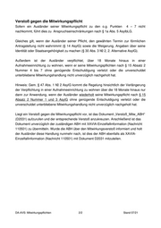 Verstoß gegen die Mitwirkungspflicht Sofern ein Ausländer seiner Mitwirkungspflicht zu den o.g. Punkten 4 – 7 nicht nachkommt, führt dies zu Anspruchseinschränkungen nach § 1a Abs. 5 AsylbLG. Gleiches gilt, wenn der Ausländer seiner Pflicht, den gewährten Termin zur förmlichen Antragstellung nicht wahrnimmt (§ 14 AsylG) sowie die Weigerung, Angaben über seine Identität oder Staatsangehörigkeit zu machen (§ 30 Abs. 3 Nr. 2, 2. Alternative AsylG). Außerdem ist der Ausländer verpflichtet, über 18 Monate hinaus in einer Aufnahmeeinrichtung zu wohnen, wenn er seine Mitwirkungspflichten nach § 15 Absatz 2 Nummer 4 bis 7 ohne genügende Entschuldigung verletzt oder die unverschuldet unterbliebene Mitwirkungshandlung nicht unverzüglich nachgeholt hat. Hinweis: Gem. § 47 Abs. 1 Nr. 2 AsylG kommt die Regelung hinsichtlich der Verlängerung der Verpflichtung in einer Aufnahmeeinrichtung zu wohnen über die 18 Monate hinaus nur dann zur Anwendung, wenn der Ausländer wiederholt seine Mitwirkungspflicht nach § 15 Absatz 2 Nummer 1 und 3 AsylG ohne genügende Entschuldigung verletzt oder die unverschuldet unterbliebene Mitwirkungshandlung nicht unverzüglich nachgeholt hat. Liegt ein Verstoß gegen die Mitwirkungspflicht vor, ist das Dokument „Verstoß_Mitw_ABH“ (D2031) aufzurufen und der entsprechende Verstoß anzukreuzen. Anschließend ist das Dokument unverzüglich der zuständigen ABH mit XAVIA-Einzelfallinformation (Nachricht 110501) zu übermitteln. Wurde die ABH über den Mitwirkungsverstoß informiert und holt der Ausländer diese Handlung nunmehr nach, ist dies der ABH ebenfalls als XAVIA- Einzelfallinformation (Nachricht 110501) mit Dokument D2031 mitzuteilen. DA-AVS: Mitwirkungspflichten 2/2 Stand 07/21