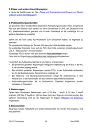 2. Pässe und andere Identitätspapiere s. hierzu die Ausführungen im Kap. „Pässe und Originaldokumente/Eingang von Pässen und/oder andere Identitätspapiere“ 3. Postzustellungsurkunden Die einzelnen AS‘en erhalten keine physischen Poststellungsurkunden (PZU). Eingehende PZU aus dem Bereich Asyl werden von dem Dienstleister für ZPE, der Deutschen Post AG, beweiswerterhaltend gescannt und in einer Postmappe an die zuständige AS zur weiteren Bearbeitung zugeleitet. Sofern die AS noch (alte) PZU-Rückläufer zum Einscannen haben, ist folgendes zu beachten: Die vorgedruckte Adresse der Zentrale Nürnberg darf nicht überklebt werden. Die zuständige Dienstelle muss auf der PZU oben links, zwischen „Zustellungsurkunde“ und „1.1 Aktenzeichen“ vermerkt werden. Rückläufige PZU´s dürfen nach dem Scannen nicht vernichtet werden. Diese sind im Original bis zum Abschluss des Verfahrens aufzubewahren. Hinsichtlich des Aufbewahrungsortes ist wie folgt zu unterscheiden: Bei persönlich gestellten Asylanträgen erfolgt die Aufbewahrung der PZU’s in der AS, in der die Akte angelegt wurde. Bei schriftlich gestellten Asylanträgen werden PZU’s in der Außenstelle aufbewahrt, die für die Bearbeitung des Asylverfahrens zuständig ist. Bei Widerrufs- und Wiederaufnahmeverfahren erfolgt die Aufbewahrung in dem Referat bzw. in der Außenstelle, die das Verfahren abschließend bearbeitet. Postzustellungsurkunden, die im Scanzentrum Düsseldorf eingescannt wurden, verbleiben in Düsseldorf. 4. Belehrungen Gehen beim Bundesamt Belehrungen nach § 20 Abs. 1 AsylG, § 22 Abs. 3 AsylG und/oder § 23 Abs. 2 AsylG ein, können diese nach dem Scannen vernichtet werden. Zur weiteren Verwendung wird auf die Regelungen im Kapitel „Hilfsakten mit Belehrung“ hingewiesen. 5. Beweismittel Zeugnisse, Urteile, Haftbefehle und andere Beweismittel, die mit der Post engehen, sind einzuscannen. DA-AVS: Posteingang 2/6 Stand 03/22