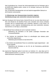 Nach Aushändigung bzw. Versand des Anhörungsprotokolls darf die Postmappe nicht in die MARiS-Akte aufgelöst werden, sondern ist zur sofortigen Löschung an das Zentral- AVS weiterzuleiten. Ggf. mit übersandte Originalgutachten sind nach bestimmungsgemäßem Gebrauch an den Einsender zurückzusenden. 15. Diffamierungs- bzw. Hinweisschreiben hinsichtlich möglicher Identitätstäuschungen oder strafrechtlich relevanter Sachverhalte Geht beim Bundesamt (AS, Service-Center, Zentral-AVS etc) ein von privat (dies können auch RA’e ohne Mandat für die betroffene Person sein) namentlich oder anonym verfasstes Schreiben oder ein Hinweisschreiben einer (Ausländer-) Behörde zu einer Person, mit Hinweisen zu einer möglichen Identitätstäuschung oder einem strafrechtlich relevanten Sachverhalt ein, ist wie folgt zu unterscheiden: 1. Die betreffende Person befindet sich noch im laufenden Verfahren: - Weiterleitung des Schreibens an den jeweils zuständigen Entscheider oder Prozesssachbearbeiter. 2. Das Verfahren der betreffenden Person ist vollumfänglich oder teilweise positiv unanfechtbar abgeschlossen: - Weiterleitung des Schreibens an das Zentral-AVS. - 3. Das Verfahren der betreffenden Person ist unanfechtbar negativ abgeschlossen oder wurde eingestellt. - Weiterleitung des Schreibens an die AS, die die Entscheidung getroffen/den Bescheid erstellt hat. Die vorgenannten Regelungen gelten für alle Arten von Verfahren. D.h., dass diese auch für Wiederaufgreifensverfahren zu § 60 Abs. 5 und 7 AufenthG sowie bei bereits laufenden Widerrufsverfahren Anwendung finden. DA-AVS: Posteingang 6/6 Stand 03/22