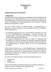 Dienstanweisung für das AVS Qualitätssicherung im Asylverfahren 1. Allgemeines Die Qualität jedes einzelnen Asylverfahrens ist angefangen von der Aktenanlage über die Entscheidung und der Bescheiderstellung bis hin zum Abschluss des Verfahrens von besonderer Bedeutung. Insbesondere ist hinsichtlich der Gesetzeslage zum Asylverfahren und der Rechtsprechung der Verwaltungsgerichtsbarkeit auf eine qualitativ hochwertige Bearbeitung der Asylverfahren zu achten. Seit dem 01.09.2017 besteht ein erweitertes System zur Qualitätssicherung im Asylverfahren, welches mehrstufig auf zwei verschiedenen Ebenen die erforderliche Qualität gewährleisten soll. Die dezentrale Qualitätssicherung, die im operativen Bereich durchgeführt wird, erfolgt für die Verfahrensabschnitte Antragsannahme, Anhörung, Bescheid und Abschlussarbeiten in einem zweistufigen Verfahren. Die Auswahl der zu prüfenden Verfahren erfolgt nach dem Stichprobenprinzip. Die zentrale Qualitätssicherung, die durch das Referat für Qualitätssicherung durchgeführt wird, umfasst zwei Prüfgrößen: Den Bescheid als eigentliches Endprodukt sowie ergänzend den Verfahrensabschnitt Abschlussarbeiten. Sie stellt eine Ergänzung der Qualitätssicherung im operativen Bereich dar und wird stichprobenbasiert durchgeführt. Ziel des erweiterten Systems ist es, zu einer Qualitätssicherung im Gesamtprozess des Asylverfahrens zu kommen. Hierfür wird das Verfahren selbst in mehrere Abschnitte unterteilt, welche für sich geprüft und dokumentiert werden. Außerdem soll hierbei eine frühestmögliche Identifizierung von Mängeln und deren Behebung vor einer weiteren Bearbeitung gesichert werden. Die einzelnen Abschnitte des Verfahrens, welche getrennt geprüft werden, sind: Antragsannahme Anhörung Abschlussarbeiten Für das AVS sind lediglich die Abschnitte Antragsannahme und Abschlussarbeiten von Bedeutung, auf die im nachfolgenden näher eingegangen wird. DA-AVS: Qualitätssicherung im Asylverfahren 1/3 Stand 09/17