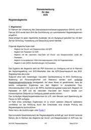 Dienstanweisung für das AVS Registerabgleiche 1. Allgemeines Im Rahmen der Umsetzung des Datenaustauschverbesserungsgesetzes (DAVG) vom 02. Februar 2016 wurde beim BVA die Durchführung von automatisierten Registerabgleichen eingeführt. Diese erfolgen für jeden registrierten Ausländer, der ein Asylgesuch geäußert hat, mit dem Ziel der Sicherung, Feststellung und Überprüfung seiner Identität. Folgende Abgleiche finden statt: - Abgleich der Grund- und Aliaspersonalien mit AZR - Abgleich der Passdaten mit AZR - Abgleich mit der nationalen Visa-Datei mit Grund- und Aliaspersonalien sowie der Passdaten - Abgleich im europäischen VISA-Informationssystem (VIS) mit Fingerabdrücken, - Abgleich in den INPOL-Sachfahndungen mit Passdaten. Das Ergebnis der Abgleiche steht als PDF-Dokument zur Verfügung und ist im Rahmen der Asylantragstellung vom AVS-Mitarbeiter über die AZR-Gesamtauskunft des BVA- Registerportals abzurufen. Aufgrund einer teils notwendigen manuellen Sachbearbeitung im BVA (Verifizierung, Bewertung auf Personengleichheit und Relevanz) werden auch vorläufige Abgleichergebnisdokumente bereitgestellt. Auf diese Weise ist gewährleistet, dass die bereits vorliegenden Ergebnisse aus dem Abgleich im europäischen Visa- Informationssystem (VIS) und in der INPOL-Sachfahndungsdatei sowie beim Abgleich mit Passdaten im AZR und der nationalen Visa-Datei den Nutzern bereits zum frühestmöglichen Zeitpunkt zur Verfügung gestellt werden können. Das (vorläufige) Abgleichergebnisdokument ist i.d.R. zehn Minuten nach Speicherung der Person im AZR verfügbar. Im Falle eines vorläufigen Ergebnisses ist zu einem späteren Zeitpunkt spätestens unmittelbar vor der Anhörung durch den Entscheider eine erneute Prüfung des Registerabgleichs durchzuführen. Siehe hierzu die Ausführungen unter Punkt 7. Das kumulierte Gesamtdokument der Registerabgleiche enthält ggf. auch ähnlich lautende Namen, die im Rahmen des Abgleichs der Grund- und Aliaspersonalien im AZR bzw. bei DA-AVS: Registerabgleiche 1/9 Stand 07/21