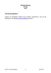 Dienstanweisung für das AVS Tod des Antragstellers Verstirbt ein Antragsteller während eines laufenden Asylverfahrens, wird auf die Regelungen in der DA-Asyl/Tod des Antragstellers verwiesen. DA-AVS: Tod des Antragstellers 1/1 Stand 07/18