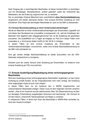 1 C 28.19). In Zweifelsfällen ist mit dem V-Ref. zu klären, ob eine erneute Bescheidzustellung durchgeführt werden soll. Wird eine erneute Bescheidzustellung durchgeführt, wird die Akte in den Prozessschritt „Bescheid mit neuer Anschrift“ weitergeleitet. Von dort wird die erneute Bescheidzustellung an alle Beteiligte angestoßen. Nach erneuter Kurzprüfung des Bescheides, richtet sich die weitere Verfahrensweise nach der Zustellungsart. 16.2 Erneute Bescheidzustellung an den Antragsteller Wird dem Bundesamt von der Post ein Bescheid - z.B. mit dem Vermerk dass das Schriftstück nicht übergeben werden konnte - zurückgesandt, ist durch das AVS zu prüfen, ob die Zustellung ordnungsgemäß durchgeführt wurde. In Zweifelsfällen ist mit dem V-Ref zu klären, ob, wie und unter welcher Anschrift der Bescheid erneut zuzustellen ist. Hierüber ist vom zuständigen AVS Mitarbeiter ggf. ein entsprechender Aktenvermerk zu fertigen und in die Akte aufzunehmen. Soll eine erneute Bescheidzustellung an den Antragsteller durchgeführt werden, ist wie folgt zu verfahren: - Der zuständige AVS Mitarbeiter holt sich die Akte aus der Registratur in seinen Arbeitskorb, erstellt und speichert in der Schriftstückliste das Anschreiben D0030 für den Antragsteller sowie ggf. eine neue PZU und druckt diese am lokalen Drucker aus. - Die von der Post zurückgesandte Bescheidausfertigung wird mit dem neu erstellten Anschreiben per PZU an den Antragsteller versandt. - Eine erneute Bescheidübersendung an die ABH erfolgt nicht. - Die Akte wird in der selben Aktivität wieder in die Registratur weitergeleitet. 16.3 Erneute Bescheidübersendung an den Antragsteller mit geänderten Personendaten nach erfolgter Berichtigung Teilt ein Antragsteller oder die ABH dem Bundesamt zutreffend mit, dass die auf dem Bescheid genannten Personendaten (Name, Geburtsdatum, Geburtsort) nicht korrekt sind und wird um eine erneute Übersendung des Bescheides mit den berichtigten Personendaten ersucht, ist dem Ersuchen des Antragstellers nur dann zu entsprechen, wenn das Bundesamt bereits zum Zeitpunkt der Zustellung des Bescheides Kenntnis der anderslautenden Personendaten hatte. In Anlehnung an den § 42 VwVfG ist es ausreichend, den zugestellten Bescheid handschriftlich zu berichtigen. Hierzu ist es zunächst erforderlich, die an den Antragsteller zugestellte Bescheidausfertigung anzufordern. DA-AVS: Zustellung 30/30 Stand 04/22