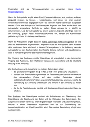 Personalien sind als Führungspersonalien zu verwenden (siehe Kapitel Registerabgleiche). Wenn der Antragsteller angibt, einen Pass/ Passersatzdokument erst zu einem späteren Zeitpunkt vorlegen zu können – beispielsweise, weil dieser bei einer anderen innerdeutschen Behörde abgegeben wurde - so kann der mobile Datenträger ausgelesen werden. Es ist eine Anfrage zur Verifizierung der Angaben zum Pass an die durch den Antragsteller angegebene Behörde zu stellen. Diese Anfrage ist in MARiS zu dokumentieren. Legt der Antragsteller zu einem späteren Zeitpunkt, allerdings noch vor der Anhörung, gültige Pass-/ Passersatzdokumente vor, werden die Auslesedaten gelöscht (vgl. Punkt 3. Löschung des Reports). Wenn der Antragsteller angibt, dass der mobile Datenträger nicht sein Eigentum ist, wird dies als Aktenvermerk aufgenommen. Allgemein muss der Antragsteller dem Auslesen nicht zustimmen, daher wird auch in diesem Fall ausgelesen. In der Anhörung kann der Antragsteller zu den Sachverhalten des Reports Stellung nehmen und plausibilisieren, dass er nicht der Eigentümer des mobilen Datenträgers ist. Der Vorgang des Auslesens mobiler Datenträger ist untergliedert in den technischen Vorgang des Auslesens, den inhaltlichen Vorgang des Auswertens und die inhaltliche Nutzung in der Anhörung. Ziel des Auslesens und Auswertens von mobilen Datenträgern ist es: - die gesetzlichen Vorgaben des § 15 Abs. 2 Nr. 6 i.V.m. §15a AsylG umzusetzen. - Indizien bzw. Plausibilisierungshinweise zur Feststellung der Identität und Herkunft des Antragstellers (Fokus: auf dem mobilen Datenträger -derzeit Mobiltelefon/Smartphone/Tablet- gespeicherte Metadaten) zu gewinnen, welche die Vorbereitung zur Anhörung unterstützen und welche in der Anhörung zu klären sind. - die für die Feststellung der Identität und Staatsangehörigkeit relevanten Daten zu erheben. Das Auslesen des Datenträgers umfasst die Aufforderung zur Überlassung des Datenträgers, die Speicherung der Daten und die Rückgabe des Datenträgers. Die ausgelesenen Daten werden zu einem Ergebnisreport verarbeitet und zusammengefasst, welcher in einem Datentresor vorgehalten und bis zur Entscheidung der Auswertelegitimation vor Zugriff geschützt wird. Eine weitere Bearbeitung erfolgt beim Auslesen nicht. DA-AVS: Auslesen von Datenträgern 3/9 Stand 10/20