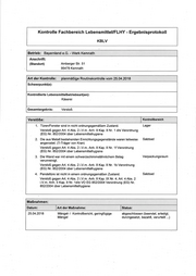 angemessenes Abflusssystem aufweisen. Salzbad 5, Die Fugen des Glasbords waren teilweise mit einem schwarzschimmelähnlichen Punkten verunreinigt. Besonders beim Zugang zum Räucherraum und an der Wand zur Filtrationsanlage. Fundstelle (Gesetz): Art. 4 Abs. 2 VO EG 852/2004i.V.m. Anh. Il Kap. IINr. 1b (VO EG 852/2004) Behebung: Silikonfugen regelmäßig ersetzen. Räucherraum 6. festgestellt am 29.06.2017 08:20: Der Fußboden ist beschädigt. Fliesen sind lose und Fugensind defekt. Fundstelle (Gesetz): Art. 4 Abs. 2 VO EG 852/2004i.V.m. Anh. It Kap. IINr. 1a (VO EG 852/2004) Behebung: Bodenbeläge sind so zu gestalten, dasssie leicht zu reinigen, erforderlichenfalls zu desinfizieren, wasserundurchlässig, Wasser abstoßend und abriebfest sind. Gegebenenfalls müssen sie ein angemessenes Abflusssystem aufweisen. Wir weisen Sie darauf hin, dass oben aufgeführte Mängelbeseitigt werden müssen. Bei Zuwiderhandlung können von behördlicher Seite weitere Maßnahmen ergriffen werden. Mit freundlichen Grüßen Erklärung des/ der Verantwortlichen (ggf. der anwesenden Person): 'V!Der Erhalt des Abdrucks wird bestätigt. | }Eine Ausfertigungdieses Kontrollberichtes wird per T]Email [_}Fax [Post an die Kontaktdaten des Betriebes versandt. Name: EEE Unterschrift: 2/2