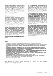 -4- forderte Ergebnis eintritt. In solchen Situationen Der 22. Jahresbericht der Kommission über könnte es angebracht sein, dass der EuGH in die Kontrolle zur Anwendung des Gemein- seinem auf der Grundlage von Art. 228 EG ge- schaftsrechts in 2005 zählte am 31. Dezember fällten Urteil die Bedingungen und Vorausset- 2004 insgesamt 4489 Vertragsverletzungsver- zungen für eine Aussetzung festlegt und auch fahren, davon 412 gegen Deutschland. Insge- vorsieht, dass die Kommission überprüfen kann, samt 73 Verfahren waren nach Art. 228 EG er- ob die Bedingungen für den Anfang und das öffnet, davon fünf gegen Deutschland. Ende der Aussetzung erfüllt sind“. In einer Entschließung von Mai 2006 zu dem 21. und 22. Jahresbericht der Kommission über die Kontrolle des Gemeinschaftsrechts begrüßt das III. Zusammenfassung Europäische Parlament (EP) die neue Kom- Grundsätzlich droht bei Nichterfüllung der durch missionsmitteilung zur Anwendung des Art. 228 den EuGH in einem Urteil nach Art. 226 EG aus- EG und fordert ausdrücklich die Anwendung der gesprochenen erforderlichen Maßnahmen die dort niedergelegten Grundsätze für alle Fälle, in Einleitung eines Verfahrens nach Art. 228 Abs. 2 denen bereits Mahnschreiben oder mit Gründen EG. Damit könnte die Festsetzung des Mindest- versehene Stellungnahmen nach Art. 228 EG pauschalbetrags (von 12,7 Mio. Euro für ergangen sind oder in denen ein Verfahren nach Deutschland) oder eines höheren, nach den dar- Art. 226 EG anhängig ist. gelegten Grundsätzen zu errechnenden Pau- Das EP fordert in der genannten Entschließung schalbetrags verbunden werden. darüber hinaus eine verstärkte Zusammenarbeit Im Falle einer Verurteilung und der Festsetzung zwischen den nationalen Parlamenten und dem eines Zwangsgelds durch den EuGH nach Art. EP bei der Kontrolle der Anwendung des Ge- 228 Abs. 2 EG könnte sich so etwa für Deutsch- meinschaftsrechts. Dadurch soll eine größere land – nach den Berechnungsmodalitäten ent- demokratische Legitimität und Bürgernähe er- sprechend der Kommissionsmitteilung – ein Ta- reicht werden. Insbesondere wird die Kommissi- gessatz von mindestens 15.240 Euro multipliziert on nachdrücklich vom EP aufgefordert, ihre Jah- mit dem Schwerekoeffizienten (1 – 20) und dem resberichte über die Kontrolle der Anwendung Dauerkoeffizienten (1 – 3) ergeben. des Gemeinschaftsrechts den nationalen Parla- menten zu übermitteln. Bislang gab es drei Verurteilungen gemäß Art. 228 EG. Quellen: - Europäische Kommission, Mitteilung zur Anwendung von Art. 228 EG, SEK(2005)1658. - Europäische Kommission, Financial Penalties for Member States who fail to comply with Judgments of the European Court of Justice: European Commission clarifies rules, MEMO/05/482, 14. Dezember 2005. - Europäischer Gerichtshof, Jahresbericht 2005, http://curia.eu.int/de/instit/presentationfr/index.htm. - Europäische Kommission, 22er Jahresbericht der Kommission über die Kontrolle der Anwendung des Gemeinschaftsrechts (2004), KOM(2005) 570, 5. November 2005. - Europäisches Parlament, Entschließung zu dem 21. und 22. Jahresbericht der Kommission über die Kontrolle des Gemeinschaftsrechts (2003 und 2004), P6_TA-PROV(2006)0202. - Baddenhausen-Lange, Vertragsverletzungsverfahren nach Art. 226 EG, Deutscher Bundestag, Fach- bereich XII, 73/05, 10. März 2005. - Grabitz/Hilf, Das Recht der Europäischen Union, 24. EL, München 2004. - Schlichting, Neue Wege bei Sanktionen gegen Mitgliedstaaten nach Art. 228 Abs. 2 EG-Vertrag?, Deutscher Bundestag, Fachbereich XII, 144/04, 29. Oktober 2004. - Streinz, EUV/ EG, München, 2003. Heike Baddenhausen, Johannes Dietrich, Fachbereich 11 – Europa, Tel.: (030) 227-33614, E-mail: vorzimmer.wf12g@bundestag.de Nr. 32/06 (12. Juni 2006)