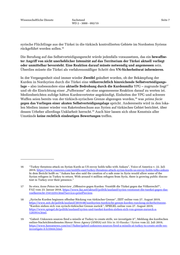 Wissenschaftliche Dienste Sachstand Seite 7 WD 2 - 3000 - 092/19 syrische Flüchtlinge aus der Türkei in die türkisch kontrollierten Gebiete im Nordosten Syriens rückgeführt werden sollen. 16 Die Berufung auf das Selbstverteidigungsrecht würde jedenfalls voraussetzen, das ein bewaffne- ter Angriff von nicht unerheblicher Intensität auf das Territorium der Türkei aktuell vorliegt oder unmittelbar bevorsteht. Eine Reaktion darauf müsste notwendig und angemessen sein. Überdies müsste die Türkei als verfahrensmäßiger Schritt den VN-Sicherheitsrat informieren. In der Vergangenheit sind immer wieder Zweifel geäußert worden, ob der Bekämpfung der Kurden in Nordsyrien durch die Türkei eine völkerrechtlich hinreichende Selbstverteidigungs- lage – also insbesondere eine aktuelle Bedrohung durch die Kurdenmiliz YPG – zugrunde liegt 17 und ob die Einrichtung einer „Pufferzone“ als eine angemessene Reaktion darauf zu werten ist. Medienberichten zufolge hätten Kurdenvertreter angekündigt, Einheiten der YPG und schwere Waffen seien bereits von der türkisch-syrischen Grenze abgezogen worden, was prima facie 18 gegen das Vorliegen einer akuten Selbstverteidigungslage spricht. Andererseits wird in den loka- len Medien immer wieder von Raketenbeschuss aus Syrien auf türkisches Gebiet berichtet, über dessen Urheber allerdings Unklarheit herrscht. Auch hier lassen sich ohne Kenntnis aller 19 Umstände keine rechtlich eindeutigen Bewertungen treffen. 16 “Turkey threatens attack on Syrian Kurds as US envoy holds talks with Ankara”, Voice of America v. 22. Juli 2019, https://www.voanews.com/middle-east/turkey-threatens-attack-syrian-kurds-us-envoy-holds-talks-ankara In dem Bericht heißt es: “Ankara has also said the creation of a safe zone in Syria would allow some of the Syrian refugees in Turkey to return. With around 4 million refugees from Syria, there is growing public discon- tent in Turkey over their presence.” 17 So etwa Anne Peters im Interview „Offensive gegen Kurden: Verstößt die Türkei gegen das Völkerrecht?“, FAZ vom 23. Januar 2018, https://www.faz.net/aktuell/politik/ausland/syrien-verstoesst-die-tuerkei-gegen-das- voelkerrecht-15412253.html?service=printPreview. 18 „Syrische Kurden beginnen offenbar Rückzug von türkischer Grenze“, ZEIT online vom 27. August 2019, https://www.zeit.de/politik/ausland/2019-08/nordsyrien-tuerkische-grenze-kurden-rueckzug-sicherheitszone. “Kurden ziehen sich von syrisch-türkischer Grenze zurück”, SPIEGEL online vom 27. August 2019, https://www.spiegel.de/politik/ausland/syrien-und-tuerkei-kurden-ziehen-sich-von-grenze-zurueck-a- 1283914.html. 19 “Gabrel: Unknown sources fired a missile at Turkey to create strife, we investigate it”, Meldung des kurdischen online-Nachrichtendienstes Hawar News Agency (ANHA) mit Sitz in Al-Hasaka / Syrien vom 22. Juli 2019, https://www.hawarnews.com/en///haber/gabrel-unknown-sources-fired-a-missile-at-turkey-to-create-strife-we- investigate-it-h10444.html.