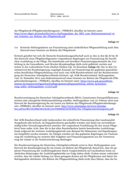 Wissenschaftliche Dienste Dokumentation Seite 9 WD 9 - 3000 - 024/16 eines neuen Pflegeberufegesetzes blieben zudem eine Vielzahl von Finanzierungsproblemen und Folgekosten unberücksichtigt. Hierzu gehörten beispielsweise systemimmanente Finanzierungs- probleme und Strukturkonflikte, die sich durch die Strukturen des Sozialgesetzbuchs für die ge- setzliche Kranken- und soziale Pflegeversicherung ergäben. Nicht berücksichtigt worden seien in dem Gutachten auch die Belastungen der Sozialhilfeträger, wenn die Pflegeausbildung und die Pflegefachkräfte primär den Krankenhäusern zu Gute kämen, und strukturelle Verantwortlichkei- ten und Kosten zur Sicherung eines pflegegestützten regionalen Versorgungsmanagements von Seniorinnen und Senioren, vgl. im Einzelnen die beigefügte Stellungnahme: Kriesten, Ursula, Stellungnahme zum Forschungsgutachten Finanzierung eines neuen Pflegeberufegesetzes zum Ergebnisbericht Prognos/WIAD, herausgegeben vom Deutschen Berufsverband für Altenpflege e. V. , Wiehl, 15. Februar 2014, abrufbar im Internet unter: http://www.dbva.de/docs/stellung- nahmen/Stellungnahme_Finanzierungsgutachten_Kriesten_DBVA_02_2014.pdf. Anlage 10 Die stellvertretende Vorsitzende des „Arbeitskreises Ausbildungsstätten für Altenpflege“ hat sich in ihrer Stellungnahme kritisch mit den Ergebnissen des Forschungsgutachtens zur Finanzierung eines neuen Pflegeberufegesetzes auseinandergesetzt, vgl. hierzu näher Kriesten, Ursula, Denn sie wissen nicht, wie es sein wird: Stellungnahme zum Ergebnisbericht des Forschungsgutachtens Finanzierung eines neuen Pflegeberufegesetzes des WIAD und der Prognos AG, in: PADUA, Zeit- schrift, 2014, S. 116 – 123. Anlage 11 Auch die Direktorin der Hans-Weinberger-Akademie der Arbeiterwohlfahrt e. V. hat erhebliche Zweifel an der Validität der dem Forschungsgutachten zu Grunde liegenden Daten und den dort ausgewiesenen Schätzungen der Kosten einer generalistischen Pflegeausbildung. Zu den in dem Gutachten nicht kalkulierten Kosten gehörten beispielsweise die Investitionskosten der Schulen, die Kosten für den Strukturumbau, die Curriculumentwicklung sowie die Kosten für die Organi- sation und Koordinierung der praktischen Ausbildung. Es sei zu befürchten, dass trotz des im Rahmen der demografischen Entwicklung steigenden Fachkräftebedarfs in Zukunft weniger Aus- bildungsplätze als heute finanzierbar seien und entsprechend die Anzahl der Auszubildenden zurückgehe, vgl. Frommelt, Mona, Präsentation zum Fachgespräch Generalistik der Hans-Wein- berger-Akademie der AWO e. V. am 29. Juli 2015, abrufbar im Internet unter: http://www.hwa- online.de/fileadmin/pdf/aktuelles/Praesentation_Generalistik_web.pdf. Anlage 12 Auch nach Auffassung der Deutschen Krankenhausgesellschaft werden die zukünftigen Mehrkos- ten einer gemeinsamen Pflegeausbildung in dem Gutachten des WIAD und der Prognos AG falsch eingeschätzt. Dies beruhe insbesondere auf „massiven Fehlannahmen“ im Bereich der Alten- pflege. Aus Mangel an Daten seien an entscheidenden Stellen die Kostenstrukturen der Gesund- heits- und (Kinder-) Krankenpflege bei der Mittelherkunft auf die Altenpflegeausbildung übertra- gen worden. Dies führe zu einer unrealistischen Darstellung des Finanzvolumens im Status quo. Für eine hinreichende Finanzierung der generalistischen Ausbildung sei mit einem höheren als dem im Gesetzentwurf ausgewiesenen Finanzierungsvolumen zu rechnen. Dies müsse zwingend berücksichtigt werden, vgl. Deutsche Krankenhausgesellschaft, Stellungnahme vom 9. Dezember 2015 zum Referentenentwurf des BMG und des BMFSFJ zum Entwurf eines Gesetzes zur Reform