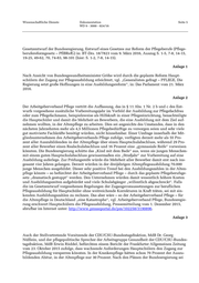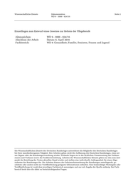Wissenschaftliche Dienste Dokumentation Seite 2 WD 9 - 3000 - 024/16 Einzelfragen zum Entwurf eines Gesetzes zur Reform der Pflegeberufe Aktenzeichen: WD 9 - 3000 - 024/16 Abschluss der Arbeit: Datum: 6. April 2016 Fachbereich: WD 9: Gesundheit, Familie, Senioren, Frauen und Jugend Die Wissenschaftlichen Dienste des Deutschen Bundestages unterstützen die Mitglieder des Deutschen Bundestages bei ihrer mandatsbezogenen Tätigkeit. Ihre Arbeiten geben nicht die Auffassung des Deutschen Bundestages, eines sei- ner Organe oder der Bundestagsverwaltung wieder. Vielmehr liegen sie in der fachlichen Verantwortung der Verfasse- rinnen und Verfasser sowie der Fachbereichsleitung. Arbeiten der Wissenschaftlichen Dienste geben nur den zum Zeit- punkt der Erstellung des Textes aktuellen Stand wieder und stellen eine individuelle Auftragsarbeit für einen Abge- ordneten des Bundestages dar. Die Arbeiten können der Geheimschutzordnung des Bundestages unterliegende, ge- schützte oder andere nicht zur Veröffentlichung geeignete Informationen enthalten. Eine beabsichtigte Weitergabe oder Veröffentlichung ist vorab dem jeweiligen Fachbereich anzuzeigen und nur mit Angabe der Quelle zulässig. Der Fach- bereich berät über die dabei zu berücksichtigenden Fragen.