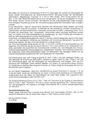 Seite2 von 2 MitE-Mailvom24.06.2019 (Posteingang 25.06.2019) beantragen Siekonkret dieHerausgabe der letzten beidenKontrollberichte der lebensmittelrechtlichen Betriebsprüfungen der Betriebsstätte "Mcdonald's", Magdeburger Chaussee10 in 06118Halle(Saale). Ihren Antrag stützen Sieauf $$ 1,2 VIG.Dem Bestimmtheitserfordernis wirdGenügegetan, da SiealsAntragsteller imVoraus nicht wissenkönnen,welchekonkreten Informationen beiderauskunftspflichtigen Stelle vorliegen Einestrengere Handhabung würdeden Informationszugang wesentlich erschweren oderunmöglich machen Es istoffensichtlich, dass einelementares Interesse des Verbrauchers daranbesteht, aufAntrag (auch) darüber Auskunft zu erhalten, ob Betriebe beiderHerstellung und/oder Verarbeitung von Lebensmitteln dielebensmittelrechtlich relevanten Vorschriften einhalten. unabhängigdavon,ob im Einzelfall die produzierten bzw. verarbeiteten Lebensmittel selbstnachteilig beeinflusst wurden bzw.von diesen eineGesundheitsgefährdung ausgegangen ist. Nach Prüfung des Antrages be- steht einInformationsanspruch aufeineSachmitteilung. Ausschluss- undBeschränkungsgründe nach$ 3 VIG bzw.Ablehnungsgründe nach$ 4 VIGliegen nichtvor.Die durchgeführt Anhörung des Betreibers der Einrichtung "Mcdonald's" hat keineAn- haltspunkte ergeben, diedem Informationsbegehren entgegenstehen Der Informationszugang erfolgt gemäß $ 5 Abs. 3 VIG durchschriftliche Auskunftsgewährung. Die begehrten Informationen werdenalsSachmitteilung inForm einer Auflistung derfestgestellten Ver- stößeübermittelt. DieAbschriften derKontrollberichte enthalten die, nach Maßgabedes Verbrau- cherinformationsgesetzes herauszugebenden, festgestellten Verstöße. Einerechtliche Subsumtion derErgebnisse sowiepersonenbezogene Datenvon Mitarbeitern des beteiligten Dritten und der Lebensmittelüberwachungsbehörde sindnicht Bestandteil derAbschriften. DieEntscheidung überIhrenAntrag ist gemäß $ 5 Abs.2 Satz3 VIG dem beteiligten Dritten, hier dem Betreiber derEinrichtung "Mcdonald's", bekannt zu geben. Nach $ 5 Abs.4 Satz2 VIG darf derInformationszugang, hierdieHerausgabe der Kontrollberichte. ersterfolgen, wenn dieEnt- scheidung dem beteiligten Dritten bekannt gegebenunddiesemeinausreichend langer Zeitraum zurEinlegung von Rechtsmitteln eingeräumt worden ist. Dahererfolgt dieHerausgabederKontroll- berichte erstnach Fristablauf Es wirddarauf hingewiesen, dasseiner Veröffentlichung dieses Schreibens im Internet, z.B.bei "Frag denStaat", sowiederVerarbeitung von DatenimSinneeinesSpeicherns und Ubermittelns. auchder Datenvon Beschäftigten derStadt Halle (Saale) nicht zugestimmt wird. insbesondere soweit personenbezogene Datenbetroffen sind DieKostenentscheidung beruht auf$ 7 Abs.l Satz VIG.Demnach ist derZugangzuInformationen nach$ 2 Abs.l Satzl Nummer l VIG biszueinemVerwaltungsaufwand von 1.000.00 € gebüh- ren-und auslagenfrei, der Zugang zu sonstigen Informationen biszu einemVerwaltungsaufwand von 250,00€ Rechtsbehelfsbelehrung Gegen diesen Bescheid kanninnerhalb einesMonatsnachBekanntgabe schriftlich oderzurNie derschrift Widerspruch beiderStadtHalle(Saale) inHalle(Saale) erhobenwerden Mitfreundlichen Grü ßen im Auftrag ███ ████ ██ ██████ ████████