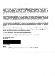 Wir weisen darauf hin, dass mit Ihrer Antragstellung ein gesetzlich definiertes Verfahren beginnt. In diesem Verfahren kann Ihre Anonymitat als Antragsteller nicht sichergestellt werden. Nach § 5 Absatz2 VIG besteht fir das VLA die gesetzliche Pflicht, auf Nachfrage des Lebensmittelunternehmers, diesem Ihren Namen und Ihre Adresse herauszugeben. Sofern ein Auskunftsersuchen des betroffenen Unternehmers beim VLA eingehen sollte, wird das VLA Ihre Daten diesem Unternehmer unmittelbar bekanntgeben. Das weitere Verfahren gestaltet sich wie nachfolgend dargestellt. Zunachst informieren wir den Dritten (Lebensmittelunternehmer) Uber Ihren Antrag. Wir geben ihm Gelegenheit, Stellung zu nehmen (Anhérung). Hierfir ist eine Frist von zwei Wochen vorgesehen. Im Anschluss entscheiden wir Uber Ihren Antrag. Die Entscheidung hierzu geben wir Ihnen und dem Dritten bekannt. Nach Bekanntgabe der Entscheidung raumen wir dem Dritten eine Frist zur Einlegung von Rechtsbehelfen ein (§ 5 Absatz 4 VIG). Erst danach kann eine etwaige Weitergabe der Informationen erfolgen. Die Informationen werden wir Ihnen mit einem gesonderten Schreiben zur Verfigung stellen. Sollte der Dritte einen Rechtsbehelf einlegen, z. B. einen Antrag auf vorlaufigen Rechtsschutz stellen, werden wir bis zum Abschluss dieses Verfahrens keine Informationen zur Verfigung stellen. Sie werden dann ggof. durch das Verwaltungsgericht beigeladen. Die Auskunftserteilung erfolgt im vorliegenden Fall kostenfrei. Die BeantwortungIhrer Anfrage erfolgt aus Datenschutzgriinden nur postalisch. Mit freundlichen Gruen im Auftrag Abteilungsleiter Anlage Merkblatt zur Erhebung von personenbezogenen Daten nach Art. 13 DSGVO