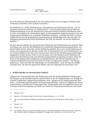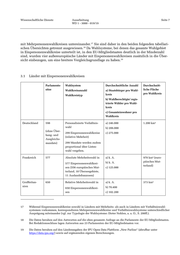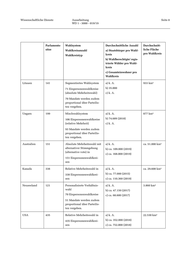 Wissenschaftliche Dienste Ausarbeitung Seite 8 WD 1 - 3000 - 019/19 Parlaments- Wahlsystem Durchschnittliche Anzahl Durchschnitt- sitze Wahlkreisanzahl a) Staatsbürger pro Wahl- liche Fläche kreis pro Wahlkreis Wahlkreistyp b) Wahlberechtigte/ regis- trierte Wähler pro Wahl- kreis c) Gesamteinwohner pro Wahlkreis Litauen 141 Segmentiertes Wahlsystem a) k. A. 933 km² 71 Einpersonenwahlkreise b) 35.000 (absolute Mehrheitswahl) c) k. A. 70 Mandate werden zudem proportional über Parteilis- ten vergeben. Ungarn 199 Mischwahlsystem a) k. A. 877 km² 106 Einpersonenwahlkreise b) 74.689 (2018) (relative Mehrheit) c) k. A. 93 Mandate werden zudem proportional über Parteilis- ten vergeben. Australien 151 Absolute Mehrheitswahl mit a) k. A. ca. 51.000 km² alternativer Stimmgebung b) ca. 109.000 (2019) (alternative vote) in c) ca. 168.000 (2019) 151 Einpersonenwahlkrei- sen Kanada 338 Relative Mehrheitswahl in a) k. A. ca. 29.600 km² 338 Einpersonenwahlkrei- b) ca. 77.000 (2015) sen c) ca. 110.360 (2019) Neuseeland 121 Personalisierte Verhältnis- a) k. A. 3.860 km² wahl b) ca. 47.150 (2017) 70 Einpersonenwahlkreise c) ca. 68.600 (2017) 51 Mandate werden zudem proportional über Parteilis- ten vergeben. USA 435 Relative Mehrheitswahl in a) k. A. 22.530 km² 435 Einpersonenwahlkrei- b) ca. 352.000 (2018) sen c) ca. 752.000 (2018)