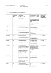 Wissenschaftliche Dienste Ausarbeitung Seite 10 WD 1 - 3000 - 019/19 Parlaments- Wahlsystem Durchschnittliche Anzahl Durchschnitt- sitze Wahlkreisanzahl a) Staatsbürger pro Wahl- liche Fläche kreis pro Wahlkreis Wahlkreistyp b) Wahlberechtigte/ regis- trierte Wähler pro Wahl- kreis c) Gesamteinwohner pro Wahlkreis Italien 630 Grabenwahlsystem Einpersonenwahlkreise: Einpersonen- 386 Mandate wurden bei wahlkreise: den Wahlen 2018 in 63 a) 256.180 (2018) 1.302 km² Mehrpersonenwahlkreisen b) k. A. über Parteilisten proportio- c) k. A. nal vergeben. 232 Einpersonenwahlkreise Mehrpersonenwahlkreise: Mehrpersonen- 12 Abgeordnete wurden von a) 941.380 (2018) wahlkreise: Auslandsitalienern in einem eigenen Wahlbezirk ge- b) k. A. 4.720 km² wählt. c) k. A Kroatien 151 Verhältniswahlrecht a) k. A. ca. 4.720 km² 12 Mehrpersonenwahlkreise b) k. A. c) ca. 350.000 (2016) Lettland 100 Verhältniswahlrecht a) k. A. ca. 12.920 km² 5 Mehrpersonenwahlkreise b) ca.310.000 (2018) c) ca. 460.000 (2018) Luxemburg 60 Verhältniswahlrecht a) k. A. ca. 647 km² 4 Mehrpersonenwahlkreise b) 65.000 (2018) c) 153.000 (2019) Österreich 193 Verhältniswahlrecht Regionalwahlkreise: Regionalwahl- Zuweisung der Mandate er- a) 191.000 (2017) kreise: folgt auf regionaler, Landes- b) 164.000 (2017) 2.150 km² und Bundesebene c) 225.000 (2017) 9 Mehrpersonenwahlkreise auf Landesebene Landeswahlkreise: Landeswahl- 38 Mehrpersonenwahlkreise kreise: auf regionaler Ebene a) 826.000 (2017) 9.300 km² b) 711.000 (2017) c) 975.000 (2017)