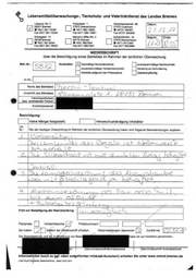 * Lebensmittelüberwachungs-, Tierschutz- und Veterinärdienst des Landes Bremen Läzaner Dr] 2207 Bmmen $x.3 Främsen. 1 27572 Bremerhaven. Moemnmene. 27472 Cuxhaven 5 [Dakim a X won ssris2eo wor were = oarzı saasor 5 3 Pandezı sentacen Fenderstaat Paz Oerzı zouaon Meina..oierSe.& ZET7S Bremen Scnacimesse Z7OTS 18 Brsmerhanen won Horn Paxderı wuraes won EEE ze o Ni über die Besichtigung eines Betriebes im Rahmen der amtlichen Überwachung Betr-de: Kontroliart: ausserplanmätige Nachkontroie. Berstung aufAnforderung ne Gebührenpiichtg zunz: Name des Betriebes: Anschrift des Betriebes: Veraiescucnei) 4 zn ammsande Person: Kontrokpersonal: Besichtigung: Keine Mängel festgestellt. | Hinweis/Aushändigung Infoblätter | der heutigen Oberprütung im Rahmen der amtlichen Überwachung haben sich igende Beanstandungen ergeben Frist zur Beseitigung der Beanstandung: Pianprobe [_] Verachtsprobe [7] Probenummem | Siehaben [___]Setemderiederschrit ematen. Rückmeidebogen überreicht ] Zurückbis [_ a zur Beseitigung innerhalb der gesetzten Frist habe ich zur Kenntnis genommen. (des Ir Verarmwericher | _Dekrr/Ürkerschi Koreroigersoral Dalurr/Urerscheit Kortrekperssea Informationen (auch zu ggf. oben aufgeführten Infoblatt-Nummern) erhalten Sie unter www.imtvet.bremen.de SATZEnehe Ba ZU01200