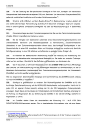 Offen A-500/15 Geschäftsbetrieb 329. Für die Erstellung des Bw-spezifischen Schriftguts in Form von „Vorlagen“ (an hierarchisch übergeordnete Stelle innerhalb der eigenen DSt) und „Berichten“ (an hierarchisch übergeordnete DSt) 16 gelten die zusätzlichen inhaltlichen und formalen Verfahrensvorgaben . 330. Entwürfe sind mit Datum und dem Zusatz „Entwurf“ im Dateinamen zu versehen. Zudem ist eine leicht wahrnehmbare Kennzeichnung als Entwurf im Dokument einzufügen. Dies kann beispiels- weise in einer Kopfzeile (mindestens Schriftgröße 16) oder als Wasserzeichen (quer in Seitenmitte) erfolgen. 331. Dokumentvorlagen aus dem Formularmanagement der Bw und den Fachinformationsportalen (OrgBer, DSt im IntranetBw) sind hierbei zu nutzen. 332. Bei der Vergabe von Dateinamen außerhalb eines Dokumentenmangementsystems sind unterschiedliche Versionen und Bearbeitungsstände zu kennzeichnen. ! Zusatzinformationen st (Metadaten) in den Dokumenteneigenschaften dienen dazu, das konkrete Schriftgutobjekt in der en sd i Gesamtheit aller in einer DSt verwalteten Akten und Vorgänge eindeutig zu verorten und damit die ng Schriftgutverwaltung in einer DSt effektiver und effizienter zu gestalten (siehe Anlage 5.6). ru de 333. Än Im Rahmen der elektronischen Aktenführung kommt der Nutzung und Anwendung von m Dateinamen und Metadaten eine herausgehobene Bedeutung zu. Sie stellen ein zentrales Ordnungs- de mittel und ein wichtiges Hilfsmittel für das Auffinden und Bearbeiten von Vorgängen dar. ht ic 334. tn Die im Dokument zu führenden Metadaten sind in der A2-500/0-0-10 beschrieben. Mit Vorlage eg des Entwurfs zur Schlusszeichnung sind die notwendigen Metadaten zu vervollständigen, da sie für rli te Metadaten-Suchmaschinen (insbesondere dem Dokumentenmanagementsystem der Bundeswehr un k [DokMBw]) und im IntranetBw benötigt werden. uc dr Alle neu begonnenen aktenrelevanten Vorgänge sind nach Einführung des DokMBw soweit zulässig us rA nur noch im DokMBw zu bearbeiten. 17 se 335. Schriftgut ist grundsätzlich zu verakten. Bei Nichtverfügbarkeit des DokMBw ist für die ie D kurzfristige Zwischenspeicherung auf die HERKULES-Netzlaufwerke zurückzugreifen. Hierfür ist für jeden GV ein eigener Ordner(-bereich) entlang der für die DSt festgelegten Ordnersystematik anzulegen. Es gilt dabei der Grundsatz der Vollständigkeit und Einheitlichkeit. Gleiches gilt analog für die Führung von Papierakten. Bis zur Einführung des DokMBw in der DSt ist Schriftgut weiterhin in Papierakten zu führen. 336. Im DokMBw dürfen Daten bis einschließlich der Einstufung VS - NUR FÜR DEN DIENSTGEBRAUCH bearbeitet werden. Die zu bearbeitenden Informationen oder die aus diesen 16 Corporate Design der Bw. 17 Die Regelungen für DokMBw gelten analog für alle IT-Fachanwendungen, die für die Veraktung vorgesehene Bearbeitung freigegeben sind. Seite 14 Stand: Juli 2021
