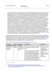 Wissenschaftliche Dienste Ausarbeitung Seite 21 WD 5 - 3000 - 032/22 tor angesiedelt, denn hier ergeben sich von Preisgestaltung über Anbieterwechsel bis zur Aus gestaltung von Prosumer- Rollen vielfältige Anwendungsmöglichkeiten. Im Auftrag der Bun desregierung wurde von der Deutschen Energieagentur (dena) ein technologieübergreifendes Pilotierungslabor, das Future Energy Lab (FEL), ins Leben gerufen. Unter dem Dach des Fu ture Energy Labs werden Energieprojekte aus der Blockchain-Strategie umgesetzt wie bei spielsweise Blockchain-basierte Energieanlagenanbindung via Smart-Meter-Gateway an eine öffentliche Datenbank. Ziel ist es, systemische Effizienzgewinne und -kosten zu untersuchen, Technikfolgen abzuschätzen und so ganzheitliche Bewertungen vornehmen zu können. Sy nergien mit anderen, neuen Technologien, wie beispielsweise Künstlicher Intelligenz oder Big Data werden ebenfalls in den Blick genommen werden. Wichtige weitere Anwendungsge biete sind z.B. Industrie 4.0, wo das Projekt "Recht- Testbed Industrie 4.0" Demonstratoren zum Testen neuer automatisierter Geschäftsprozesse basierend auf Blockchain-Technologie aufbaut, und Entwicklungsprojekte im Rahmen des von der Gesellschaft für Internationale Zusammenarbeit GmbH im Auftrag der Bundesregierung gegründeten Blockchain-Labs. Ebenso zählen dazu Logistikprojekte im Projekt „Silicon Economy“ des Fraunhofer IML Dort mund und der Innovationsinitiative mFUND, Verbundprojekte zu Industrie 4.0 und Produkti onstechnologien, oder Projekte zur Transparenz von Liefer- und Wertschöpfungsketten u.a. im Lebensmittelbereich. Zur Berücksichtigung von Nachhaltigkeitsaspekten wurde vom Wup 40 pertal Institut für Klima, Umwelt und Energie eine Kurzstudie erstellt.“ Eine eigene Recherche (siehe Tabelle 3) in der Förderdatenbank des Bundes (www.foerderdaten bank.de, Stand 10.3.2022, Stichwort „Blockchain“) zeigte, dass aktuell sieben Programme (darun ter ein Programm mit vier Modulen) explizit auf den Einsatz von Blockchain als möglichen För dergegenstand hinweisen. Die Programme an sich sind breit gefächert und adressieren unter schiedlichste Unternehmensgrößen und Anwendungsbereiche. Tabelle 3: Aktuelle Förderprogramme (www.foerderdatenbank.de, Stand 10.3.2022) Förderpro Ministe Förderbe Förderhöhe Webseite gramm (Name) rium rechtigte DeepTech Fu BMWK Existenzgrün Die Förderung erfolgt als Beteili https://www.fo ture Fonds der/in, Unter gung. erderdaten (DTFF) nehmen bank.de/FDB/Co Der Fonds investiert als Co-Inves ntent/DE/Foer tor nur gemeinsam mit privaten derpro kooperierenden Beteiligungsge gramm/Bund/B bern. Das private Investment wird MWi/deeptech- durch den DTFF im Verhältnis future- von mindestens 30% (privat) zu fonds.html bis zu 70% (öffentlich) gespiegelt. Der Betrag pro Unternehmen ist über alle Finanzierungsrunden auf 40 BMWi (2021), Die deutsche Blockchain-Strategie - Stand der Umsetzung und Ausblick, https://www.bmwi.de/Redaktion/DE/Downloads/B/bekanntmachung-umsetzung-blockchain-strate gie.pdf?__blob=publicationFile&v=4, S. 2f.