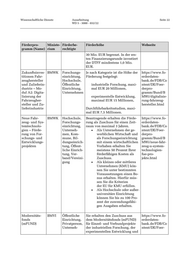 Wissenschaftliche Dienste Ausarbeitung Seite 22 WD 5 - 3000 - 032/22 Förderpro Ministe Förderbe Förderhöhe Webseite gramm (Name) rium rechtigte 30 Mio. EUR begrenzt. In der ers ten Finanzierungsrunde investiert der DTFF mindestens 1,0 Mio. EUR. Zukunftsinves BMWK Forschungs Je nach Kategorie ist die Höhe der https://www.fo titionen Fahr einrichtung, Förderung festgelegt: erderdaten zeughersteller Hochschule, bank.de/FDB/Co und Zulieferin Öffentliche industrielle Forschung, maxi ntent/DE/Foer dustrie – Mo Einrichtung, mal EUR 20 Millionen, derpro dul A2: Digita Unternehmen gramm/Bund/B lisierung der experimentelle Entwicklung, MWi/digitalisie Fahrzeugher maximal EUR 15 Millionen, rung-fahrzeug steller und Zu hersteller.html lieferindustrie Durchführbarkeitsstudien, maxi mal EUR 7,5 Millionen. Neue Fahr BMWK Hochschule, Beantragende erhalten die Förde https://www.fo zeug- und Sys Forschungs rung als Zuschuss für einen Zeit erderdaten temtechnolo einrichtung, raum von maximal 3 Jahren. bank.de/FDB/Co gien – Förde Unterneh • Als Unternehmen der ge ntent/DE/Foer rung von For men, Kom werblichen Wirtschaft und derpro schungs- und mune, Bil als Forschungseinrichtung gramm/Bund/B Entwicklungs dungseinrich mit einem wirtschaftlichen MWi/neue-fahr projekten tung, Öffent Vorhaben erhalten Sie zeug-u-system liche Einrich meistens 50 Prozent Ihrer technologien- tung, Ver förderfähigen Kosten als fue-pro band/Vereini Zuschuss. jekte.html gung • Als kleines oder mittleres Unternehmen (KMU) kön nen Sie unter bestimmten Voraussetzungen einen Bo nus erhalten. Hierfür müs sen Sie die Kriterien der EU für KMU erfüllen. • Als Hochschule oder außer universitäre Einrichtung können Sie bis zu 100 Pro zent der zuwendungsfähi gen Ausgaben erhalten. Modernitäts BMVI Öffentliche Sie erhalten den Zuschuss aus https://www.fo fonds Einrichtung, dem Modernitätsfonds (mFUND) erderdaten (mFUND) Privatperson, für Einzel- und Verbundprojekte bank.de/FDB/Co Unterneh der industriellen Forschung, der ntent/DE/Foer experimentellen Entwicklung und