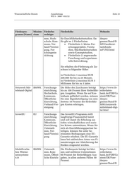 Wissenschaftliche Dienste Ausarbeitung Seite 23 WD 5 - 3000 - 032/22 Förderpro Ministe Förderbe Förderhöhe Webseite gramm (Name) rium rechtigte men, Hoch für Durchführbarkeitsstudien. Da derpro schule, Kom für gibt es 2 Förderlinien: gramm/Bund/B mune, Ver • Förderlinie 1: kleine For MVI/moderni band/Vereini schungsprojekte, Vorstu taetsfonds- gung, For dien, Machbarkeitsstudien mFUND.html schungsein sowie Konzeptstudien, richtung • Förderlinie 2: angewandte Forschung und experimen telle Entwicklung. Sie erhalten die Förderung als Zu schuss in folgender Höhe: in Förderlinie 1 maximal EUR 200.000 für bis zu 24 Monate, in Förderlinie 2 maximal EUR 3 Millionen für bis zu 3 Jahre. Netzwerk Mit BMWK Forschungs Die Höhe des Zuschusses beträgt https://www.fo telstand-Digital einrichtung, bis zu 100 Prozent Ihrer förderfähi erderdaten Hochschule, gen Ausgaben. Wenn Sie auf Kos bank.de/FDB/Co Kommune, tenbasis gefördert werden, müssen ntent/DE/Foer Öffentliche Sie eine Eigenbeteiligung von min derpro Einrichtung, destens 10 Prozent der förderfähi gramm/Bund/B Verband/Ver gen Kosten erbringen. MWi/netzwerk- einigung mittelstand-digi tal.html InvestEU EU Forschungs Das InvestEU-Programm stellt einrichtung, langfristige Finanzmittel bereit Kommune, und soll damit die Erholung aus Öffentliche tiefen wirtschaftlichen und sozia Einrichtung, len Krisen unterstützen. Wenn Sie Unterneh sich als Durchführungspartner be men, Ver teiligen, können Sie unter be band/Vereini stimmten Bedingungen eine EU- gung Garantie erhalten. Die EU-Garantie kann bei zahlreichen Arten von Fi nanzierungen zur Absicherung der Risiken eingesetzt werden. Modellvorha BMWK Unterneh Die Förderquote beträgt bei klei https://www.fo ben Wärme men, Kom nen und mittleren Unternehmen erderdaten netzsysteme mune, Öffent 60 Prozent der förderfähigen Aus bank.de/FDB/Co 4.0: liche Einrich gaben, in allen anderen Fällen 50 ntent/DE/Foer Prozent. derpro gramm/Bund/B