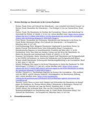 Wissenschaftliche Dienste Dokumentation Seite 11 WD 1 - 3000 - 003/22 4. Weitere Beiträge zur Demokratie in der Corona-Pandemie - Decker, Frank: Krise und Zukunft der Demokratie – was verändert sich durch Corona?, In: Decker, Frank: Baustellen der Demokratie – Von Stuttgart 21 bis zur Corona-Krise, Bonn 2021 - Decker, Frank: Die Demokratie im Zeichen der Coronakrise. Chance oder Bedrohung? In: Zeitschrift für Politik, 67 (2020), 2, S.123-132, online abrufbar unter: https://www.nomos- elibrary.de/10.5771/0044-3360-2020-2-123/die-demokratie-im-zeichen-der-coronakrise- chance-oder-bedrohung-jahrgang-67-2020-heft-2?page=1 - Forst, Rainer: Dynamiken des Vertrauens. Demokratie und Solidarität in der Krise, In: Frank-Walter Steinmeier (Hrsg.): Zur Zukunft der Demokratie – 36 Perspektiven, München 2022, S. 317-325 - Graf Kielmansegg, Peter: Belagerte Demokratie: Legitimität in unsicheren Zeiten, In: Martin Florack/ Karl-Rudolf Korte/ Julia Schwanholz (Hrsg.): Coronakratie. Demokratisches Regieren in Ausnahmezeiten, Frankfurt am Main 2021, S. 43-50 - Heidenreich, Felix: Den Staat neu denken: Corona und die Krise der Demokratie, In: Blätter für deutsche und internationale Politik, 67 (2022),1, S. 97-104 - Hummel, Siri/Schrader, Malte/ Strachwitz/ Rupert Graf: Demokratie und Zivilgesellschaft in der COVID-19-Pandemie, In: Institut für Demokratie und Zivilgesellschaft (Hrsg.): Wissen schafft Demokratie. Schwerpunkt Demokratiegefährdung in der Coronakrise, Band 9, 2021, Jena, S. 148-159 - Merkel, Wolfgang: Wer regiert in der Krise? Demokratie in Zeiten der Pandemie? In: WSI- Mitteilungen, 73 (2020), 6, S. 445-453, online abrufbar unter: https://www.nomos- elibrary.de/10.5771/0342-300X-2020-6-445/wer-regiert-in-der-krise-demokratie-in-zeiten- der-pandemie-jahrgang-73-2020-heft-6?page=1 - Schiller, Christof u.a.: Nachhaltiges Regieren im Kontext der Coronakrise – Wie resilient sind die OECD- und EU-Staaten wirklich?, Herausgegeben von Bertelsmann Stiftung, 2021, online abrufbar unter: https://www.bertelsmann- stiftung.de/de/publikationen/publikation/did/nachhaltiges-regieren-im-kontext-der- coronakrise-all - Spinney, Laura: Wenn es ernst wird. Stärken und Schwächen der Demokratie im Kampf gegen die Pandemie, In: Thomas Mirow (Hrsg.): Demokratie in Bedrängnis: Warum wir jetzt gefragt sind. Berichte zur Lage der Nation, Hamburg 2021, S. 39-65 - Ziblatt, Daniel: Der wirksame Staat. Was uns die Corona-Pandemie über die Widerstandsfähigkeit von Demokratien sagt, In: Frank-Walter Steinmeier (Hrsg.): Zur Zukunft der Demokratie – 36 Perspektiven, München 2022, S. 327-334 5. Pressedokumentation ***