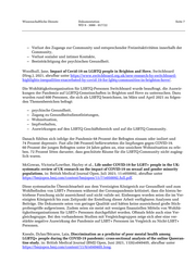 Wissenschaftliche Dienste Dokumentation Seite 7 WD 9 - 3000 - 017/22 – Verlust des Zugangs zur Community und entsprechender Freizeitaktivitäten innerhalb der Community, – Verlust sozialer und intimer Kontakte, – Beeinträchtigung der psychischen Gesundheit. Woodhull, Jane, Impact of Covid-19 on LGBTQ people in Brighton and Hove, Switchboard (Hrsg.), 2021, abrufbar unter https://www.switchboard.org.uk/new-research-by-switchboard- highlights-inequalities-exacerbated-by-covid-19-for-lgbtq-communities-in-brighton-hove/. Die Wohltätigkeitsorganisation für LSBTQ-Personen Switchboard wurde beauftragt, die Auswir kungen der Pandemie auf LGBTQ-Gemeinschaften in Brighton und Hove zu untersuchen. Dazu wurden rund 600 Personen, die sich als LSBTQ bezeichnen, im März und April 2021 zu folgen den Themenbereichen befragt: – psychische Gesundheit, – Zugang zu Gesundheitsdienstleistungen, – Wohnsituation, – Impfverhalten, – Auswirkungen auf den LSBTQ Geschäftsbereich und auf die LSBTQ Community. Danach fühlten sich infolge der Pandemie 68 Prozent der Befragten einsam oder isoliert und 74 Prozent depressiv. Fast alle (98 Prozent) befürworteten die Impfungen gegen COVID-19. 60 Prozent der jungen Befragten unter 24 Jahre gaben an, eine unsichere Wohnsituation zu erle ben. 72 Prozent litten darunter, dass geschützte Räume für die LSBTQ-Community nicht zugäng lich waren. McGowan, Victoria/Lowther, Hayley et al., Life under COVID-19 for LGBT+ people in the UK: systematic review of UK research on the impact of COVID-19 on sexual and gender minority populations, in: British Medical Journal Open, Juli 2021; 11:e050092, abrufbar unter https://bmjopen.bmj.com/content/bmjopen/11/7/e050092.full.pdf. Diese systematische Übersichtsarbeit aus dem Vereinigten Königreich zur Gesundheit und zum Wohlbefinden von LSBT+ Personen während der Coronapandemie kritisiert, dass die hierzu be triebene Forschung nicht ausreichend und nicht valide sei. Einbezogen worden seien die im Ver einigten Königreich bis zum Zeitpunkt der Erstellung dieser Arbeit verfügbaren Analysen und Beiträge. Die Dokumente seien von geringer Qualität und hätten keine ausreichend große Stich probengröße aufgewiesen. Zudem seien sie meist mit wenigen finanziellen Mitteln von Wohltä tigkeitsorganisationen für LSBT+ Personen durchgeführt worden. Oftmals fehle auch eine Ver gleichsgruppe. Bei den vorhandenen Studien mit Vergleichsgruppen zeige sich aber eine ver stärkte negative Auswirkung der Pandemie auf LSBT+ Personen im Vergleich zu Nicht-LSBT+ Personen. Kneale, Dylan/Bécares, Laia, Discrimination as a predictor of poor mental health among LGBTQ+ people during the COVID-19 pandemic: cross-sectional analysis of the online Queeran tine study, in: British Medical Journal (BMJ) Open, Juni 2021, 11(6):e049405, abrufbar unter https://bmjopen.bmj.com/content/11/6/e049405.long.