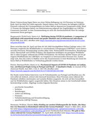 Wissenschaftliche Dienste Dokumentation Seite 8 WD 9 - 3000 - 017/22 Dieser Untersuchung liegen Daten aus einer Online-Befragung von 310 Personen im Zeitraum Ende April bis Mitte Juli 2020 zugrunde. Danach hätten rund 70 Prozent der befragten LSBTQ+ Personen während der Coronapandemie ein hohes Maß an depressiven Symptomen erlebt. Rund 17 Prozent der Befragten hätten von Diskriminierung aufgrund der Zugehörigkeit zur LSBTQ+ Community berichtet. In dem Zusammenhang sei auch der durchschnittliche Wert für wahrge nommenen Stress gestiegen. Buspavanich, Pichit/Lech, Sonia et al., Well-being during COVID-19 pandemic: A comparison of individuals with minoritized sexual and gender identities and cis-heterosexual individuals, PLOS ONE, Juni 2021, abrufbar unter https://journals.plos.org/plosone/article?id=10.1371/jour nal.pone.0252356. Diese zwischen dem 20. April und dem 20. Juli 2020 durchgeführte Online-Umfrage unter 2.332 Personen vergleicht das Wohlbefinden in verschiedenen Untergruppen (LSBTIQA+ sowie hetero sexuelle Personen). Berücksichtigt wurden dabei Alter, Wohnumfeld, Erwerbsstatus, Beziehungs status, Elternschaft und COVID-19-Status. Die Ergebnisse bestätigten ein geringeres Wohlbefin den in allen Gruppen während der COVID-19-Pandemie. Sie deuteten darüber hinaus auf ein ge ringeres Wohlbefinden bei LSBTIQA+ im Vergleich zu heterosexuellen Personen hin. Zudem zeige sich, dass das Leben in Städten sowie das Zusammensein in einer Beziehung mit einem hö heren Maß an Wohlbefinden in Verbindung gebracht werden könne. Pereira, Henrique/Pedro, Jéssica et al., Psychosocial Impacts of COVID-19 Pandemic on Lesbian, Gay, and Bisexual People Living in Portugal and Brazil – A Qualitative Study, in: Journal of Psy chosexual Health, Juni 2021, 3 (2), S. 146–159, abrufbar unter https://journals.sagepub.com/doi/full/10.1177/26318318211017466. Die Studie wertet Online-Interviews von 65 Teilnehmenden aus Portugal und Brasilien aus, die sich selbst als lesbisch, schwul oder bisexuell bezeichnen. Diese Personen seien während der Pandemie erhöhten emotionalen und sozialen Risiken ausgesetzt, die sich auf ihre Gesundheit und ihr Wohlbefinden negativ ausgewirkt hätten. Ihre Situation müsse in der Gesellschaft stärker berücksichtigt werden. Abgefragt wurden folgende Bereiche: – psychische Gesundheit, – Isolation, – Beziehungen, – Arbeit und Bildung, – Finanzen, – Verhaltensänderung und Krisenbewältigung, – spezifische LSBTQI-Themen. Herrmann, Wolfram, Charité, Policy Briefing zur zweiten Erhebungswelle der Studie „Die Situa tion von Menschen in Deutschland während der Corona-Pandemie“, Stand: 4. März 2021, abruf bar unter https://allgemeinmedizin.charite.de/fileadmin/user_upload/microsites/m_cc01/allg med/DOCS/coronaleben2_policybriefing.pdf sowie Fachhochschule Münster, Wie geht es Men schen während der Corona-Pandemie?, 16. April 2020, abrufbar unter https://www.fh-muens ter.de/hochschule/aktuelles/pressemitteilungen.php?pmid=8229.