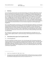 Wissenschaftliche Dienste Ausarbeitung Seite 4 WD 6 - 3000 - 004/22 1. Einleitung Am 10. Dezember 2021 beschloss der Deutsche Bundestag zum Schutz der öffentlichen Gesund heit und vulnerabler Personengruppen das Gesetz zur Stärkung der Impfprävention gegen CO VID-19 und zur Änderung weiterer Vorschriften im Zusammenhang mit der COVID-19-Pande 1 mie. Im Zuge dessen wurde das Infektionsschutzgesetz (IfSG) um den neuen § 20a IfSG ergänzt, der die Vorlage eines Immunitätsnachweises gegen das Coronavirus SARS-CoV-2 im Gesund heits- und Pflegesektor normiert. Demnach müssen Personen, die in den in der Vorschrift be zeichneten Einrichtungen und Unternehmen tätig sind, ab dem 15. März 2022 nachweisen, dass sie entweder geimpft oder genesen im Sinne des § 2 Nr. 2 oder 4 der COVID-19-Schutzmaßnah men-Ausnahmenverordnung (SchAusnahmV) sind oder ein ärztliches Zeugnis über das Bestehen einer medizinischen Kontraindikation vorweisen können (sogenannte einrichtungsbezogene Impfpflicht). Die in § 20a IfSG geregelten einrichtungs- und unternehmensbezogenen Pflichten zum Nachweis einer Impfung, Genesung oder Kontraindikation sowie die Folgen der Nichtvorlage eines entspre chenden Nachweises können sich auch auf die Arbeitsverhältnisse zwischen den nachweis pflichtigen Personen und den betroffenen Einrichtungen oder Unternehmen auswirken. Hierbei ist zwischen Personen, die bereits vor dem 15. März 2022 in den Einrichtungen oder Unterneh men tätig sind, und Personen, die dort erst ab oder nach dem 16. März 2022 tätig werden sollen, zu unterscheiden. Die vorliegende Ausarbeitung legt zunächst den Regelungsgehalt des § 20a IfSG dar. Im An schluss werden mögliche arbeits-, sozialversicherungs- und leistungsrechtliche Konsequenzen erörtert. 2. Immunitätsnachweis gegen Covid-19 gemäß § 20a IfSG 2.1. Anwendungsbereich Die Nachweispflichten betreffen Personen, die in Einrichtungen oder Unternehmen tätig sind, welche typischerweise dem Aufenthalt, der Behandlung oder Pflege besonders vulnerabler Perso 2 nengruppen dienen. Die betroffenen Einrichtungen sind in § 20a Abs. 1 Satz 1 Nr. 1 bis 3 IfSG abschließend aufgezählt. Diejenigen Personen, welche in den Einrichtungen oder Unternehmen behandelt, betreut, gepflegt oder untergebracht sind, sind von Pflichten gemäß § 20a Abs. 6 IfSG ausdrücklich ausgenommen. 1 Gesetz vom 10. Dezember 2021 - BGBl. I 2021, S. 5162. 2 Gesetzentwurf der Fraktionen SPD, BÜNDNIS 90/DIE GRÜNEN und FDP, Entwurf eines Gesetzes zur Stärkung der Impfprävention gegen COVID-19 und zur Änderung weiterer Vorschriften im Zusammenhang mit der CO- VID-19-Pandemie, Bundestagsdrucksache 20/188 vom 6. Dezember 2021, S. 37.