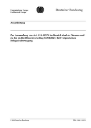 Unterabteilung Europa Ausarbeitung Seite 2 Fachbereich Europa PE 6 - 3000 - 015/22 Zur Anwendung von Art. 115 AEUV im Bereich direkter Steuern und zu der im Richtlinienvorschlag COM(2021) 823 vorgesehenen Befugnisübertragung Aktenzeichen: PE 6 - 3000 - 015/22 Abschluss der Arbeit: 25. März 2022 Fachbereich: PE 6: Fachbereich Europa Die Arbeiten des Fachbereichs Europa geben nicht die Auffassung des Deutschen Bundestages, eines seiner Organe oder der Bundestagsverwaltung wieder. Vielmehr liegen sie in der fachlichen Verantwortung der Verfasserinnen und Verfasser sowie der Fachbereichsleitung. Arbeiten des Fachbereichs Europa geben nur den zum Zeitpunkt der Erstel lung des Textes aktuellen Stand wieder und stellen eine individuelle Auftragsarbeit für einen Abgeordneten des Bun destages dar. Die Arbeiten können der Geheimschutzordnung des Bundestages unterliegen, geschützte oder andere nicht zur Veröffentlichung geeignete Informationen enthalten. Eine beabsichtigte Weitergabe oder Veröffentlichung ist vorab der Fachbereichsleitung anzuzeigen und nur mit Angabe der Quelle zulässig. Der Fachbereich berät über die da bei zu berücksichtigenden Fragen.