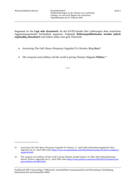 Wissenschaftliche Dienste Kurzinformation Seite 5 Waffenlieferungen an die Ukraine aus westlichen Ländern vor und nach Beginn des russischen Angriffskrieges am 24. Februar 2022 Insgesamt ist die Lage sehr dynamisch, da die NATO-Länder ihre Lieferungen dem russischen Aggressionspotential fortlaufend anpassen. Folgende Referenzpublikationen werden jedoch regelmäßig aktualisiert und liefern daher eine gute Übersicht: 31 • Answering The Call: Heavy Weaponry Supplied To Ukraine, Blog Oryx 32 • The weapons and military aid the world is giving Ukraine, Magazin Politico *** 31 Answering The Call: Heavy Weaponry Supplied To Ukraine, 11. April 2022 (Aktualisierungsdienst), Oryx, abgerufen am 21. April 2022 unter https://www.oryxspioenkop.com/2022/04/answering-call-heavy-weaponry- supplied.html 32 The weapons and military aid the world is giving Ukraine, Joseph Gedeon, 22. März 2022 (Aktualisierungs dienst), Politico, abgerufen am 21. April 2022 unter https://www.politico.com/news/2022/03/22/ukraine-wea pons-military-aid-00019104. Fachbereich WD 2 (Auswärtiges, Völkerrecht, wirtschaftliche Zusammenarbeit und Entwicklung, Verteidigung, Menschenrechte und humanitäre Hilfe)