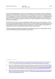 Wissenschaftliche Dienste Sachstand Seite 5 WD 9 - 3000 - 013/22 Innerhalb der Mitgliedstaaten der EU ist zu differenzieren zwischen den an diese ausgelieferten Dosen und den tatsächlich verimpften Dosen. So hat Dänemark mehr Dosen verimpft als es über die EU bezogen hat, da das Land zusätzlich auf eigenem Wege – ohne die EU – Impfstoffe gekauft 7 hat. Demgegenüber werden in vielen Ländern nicht alle gelieferten Dosen auch tatsächlich ver- abreicht, u. a. weil Länder im Rahmen der COVAX-Initiative Impfstoffe aus ihrem Kontingent an 8 ärmere Länder abgeben. Das ECDC verweist darauf, dass alle aufgeführten Zahlen mit Vorsicht und dem Wissen um die Limitierungen der Datenerhebung zu bewerten seien, da die Datenbank auf das Meldesystem und die gemeldeten Zahlen der einzelnen Staaten angewiesen ist. Zudem ergäben sich zeitliche Ver- zögerungen zwischen der Meldung der Zahlen und ihrer Verarbeitung. Anhand der Datenbank ergab sich folgende Aufteilung mit Stand vom 15. Februar 2022, der Da- 9 ten einschließlich der sechsten Kalenderwoche umfasste: 7 Beschaffung von Impfstoff: Europa hat ein Vertrauensproblem, Süddeutsche Zeitung online, 2. März 2021, ab- rufbar unter https://www.sueddeutsche.de/politik/corona-europa-impfallianz-kleine-laender-1.5222929 . 8 COVAX ist die Abkürzung für COVID-19 Vaccines Global Access, einer Initiative, die einen weltweit gleichmä- ßigen und gerechten Zugang zu COVID-19-Impfstoffen gewährleisten will. Zur COVAX-Initiative siehe UNICEF, COVAX und UNICEF: Corona-Impfstoff für die ärmsten Länder, abrufbar unter https://www.unicef.de/informie- ren/projekte/unicef-ziele-110800/hygiene-111244/coronavirus-impfstoffe-fuer-die-aermsten-laender/235762. 9 European Centre for Disease prevention a nd Control, COVID-19 Vaccine Tracker, Doses by Product und Country Profiles, fortlaufend aktualisierter Stand, abrufbar unter https://qap.ecdc.europa.eu/public/extensions/COVID- 19/vaccine-tracker.html#summary-tab.